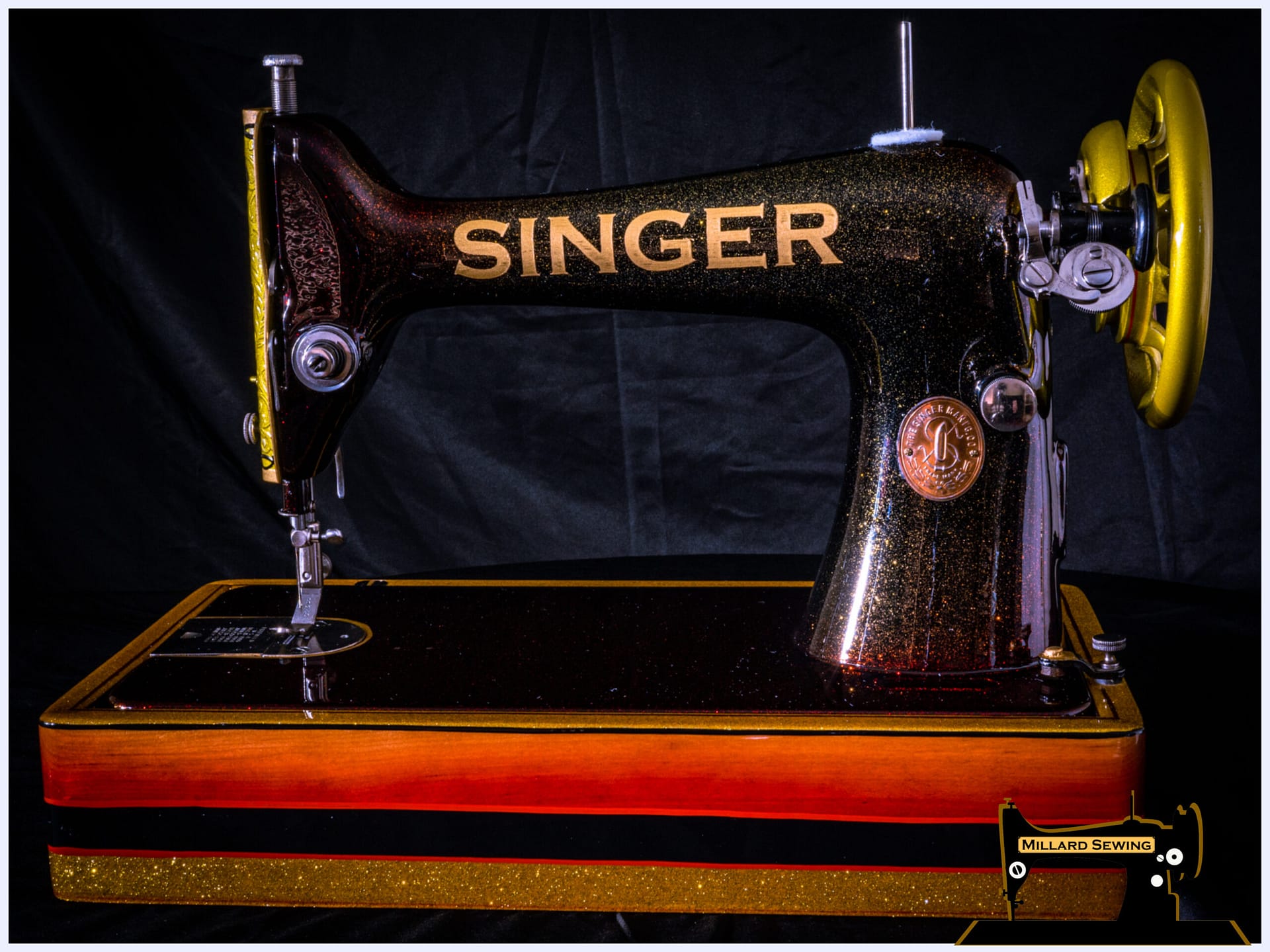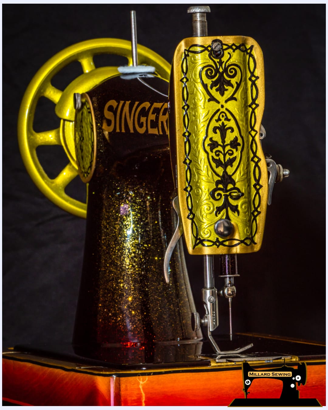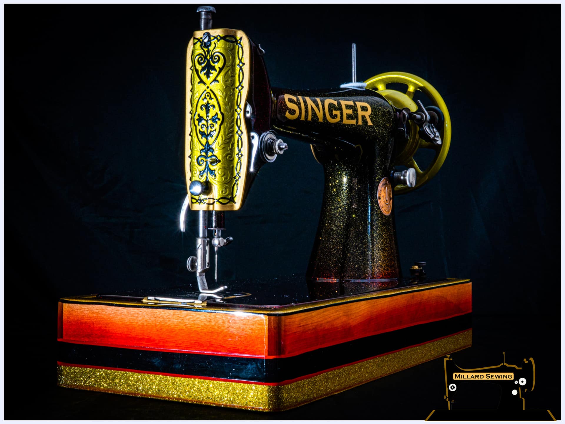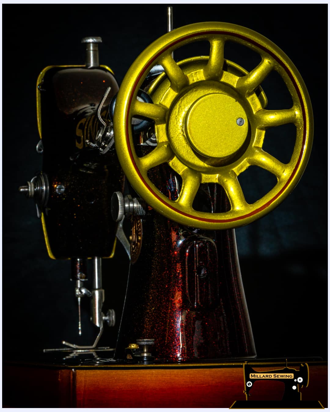 This Singer Model 66 is Serial Number G5825171 Dating it to November 30, 1917 and Manufactured in Elizabeth New Jersey. This machine wasn’t in terrible shape but that first one hundred years of service had left the finish a little worse for wear. We tore the machine down and sent it off to Phil at Syrarium Studios with a few colors that we liked and not much else to hinder his creativity. Once we received the machine back, we went through and polished up the bright work making the necessary repairs and adjustments along the way. This 102 year old piece of jewelry once again looks as good as it sews.