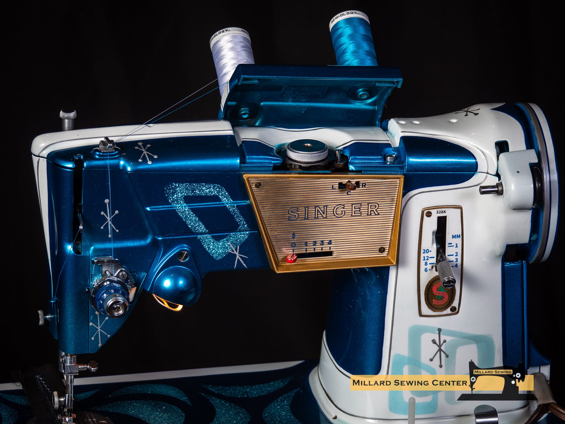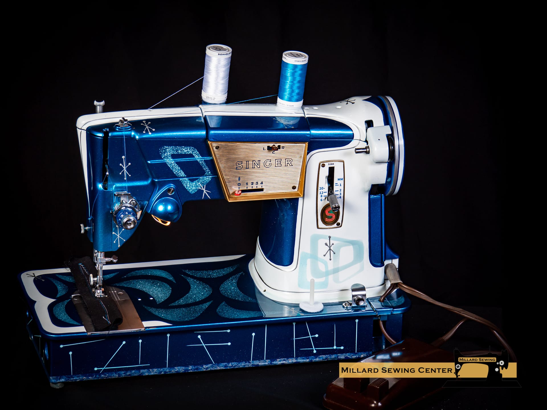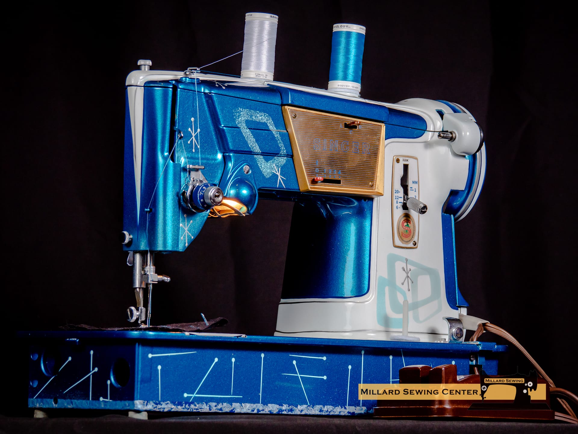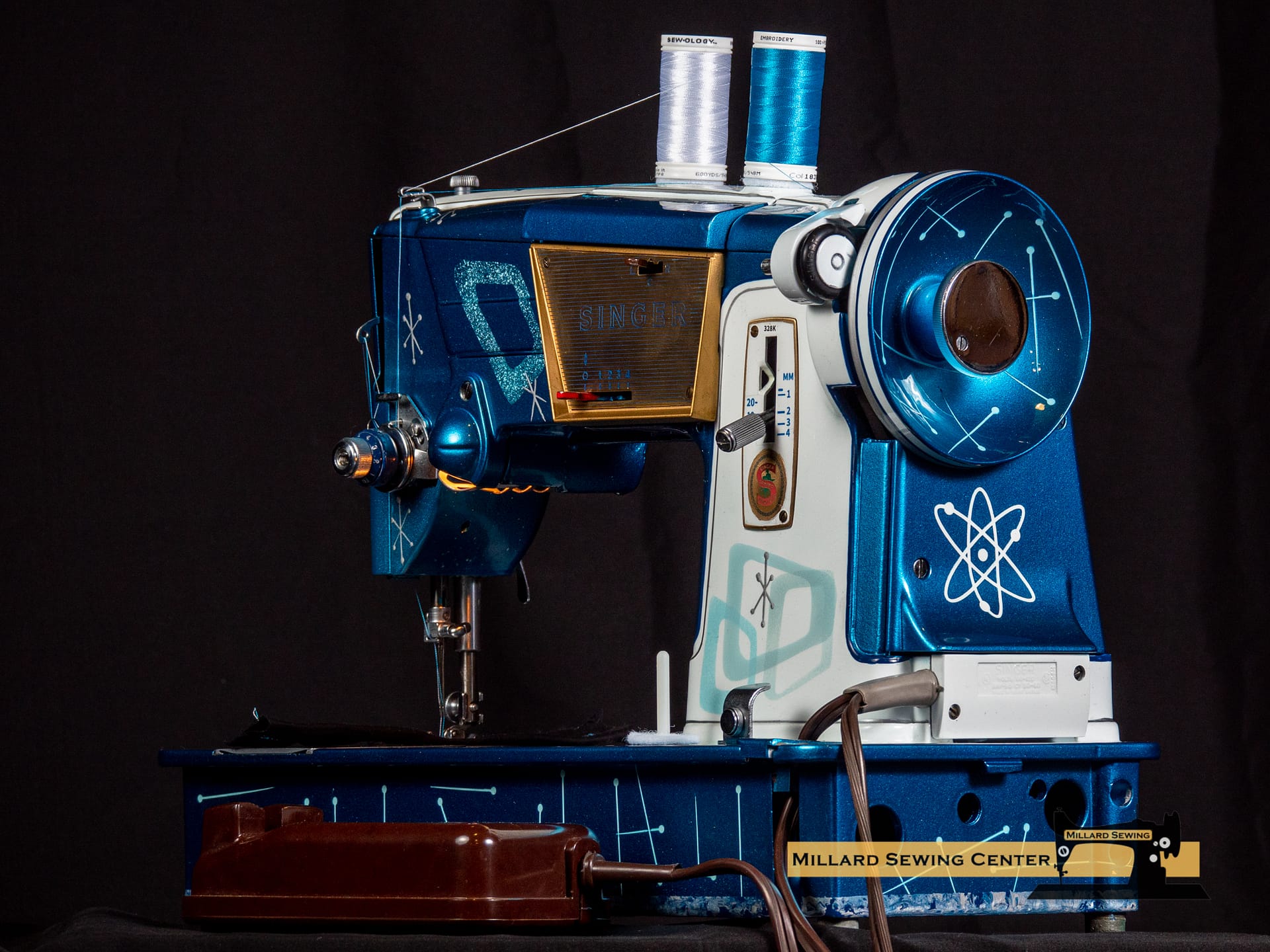It may not be quite as true today, but traditionally even mass produced products start off with a designer working away to create something pleasing to the eye. In the early days of the Singer Sewing Machine these shapes were accented with gloss black paint and detailed graphics that made the machine as much a piece of artwork as a tool that would last over 100 years and counting. After World War II the black head era of machine was being phased out and Singer was changing their style. Many machines still had great bones, but gone was the gloss black and graphics. Instead they were replaced with assorted tan and grey colored tones. While some of the machines still have a quite handsome look to them, we couldn’t help but wonder what would happen if we took that style of “Atomic Era” Art and applied it to the Mid Century Modern lines that a machine already had.
