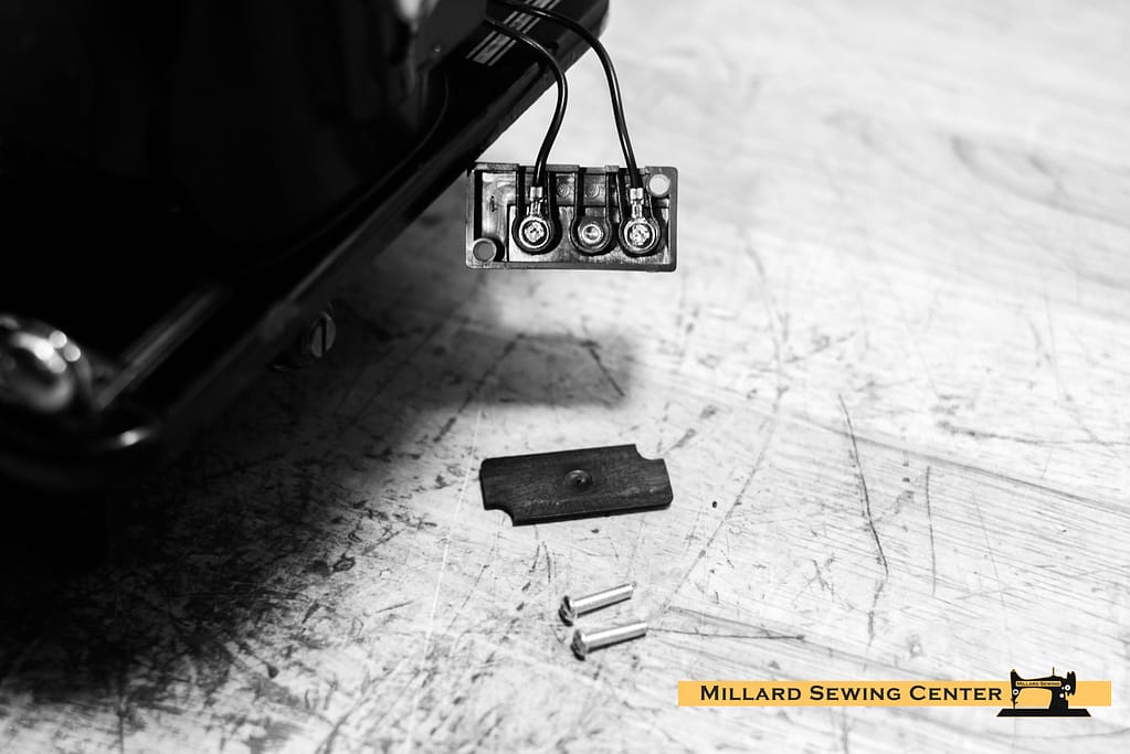 Attach the light cord as pictured. With the wires exiting towards the top of the plug remove the left side wire. Move this original screw to the center position with one light wire. Use the Millard Sewing provided screw to reattach the left motor wire along with the other light wire to the left position. Reinstall the power connection block.