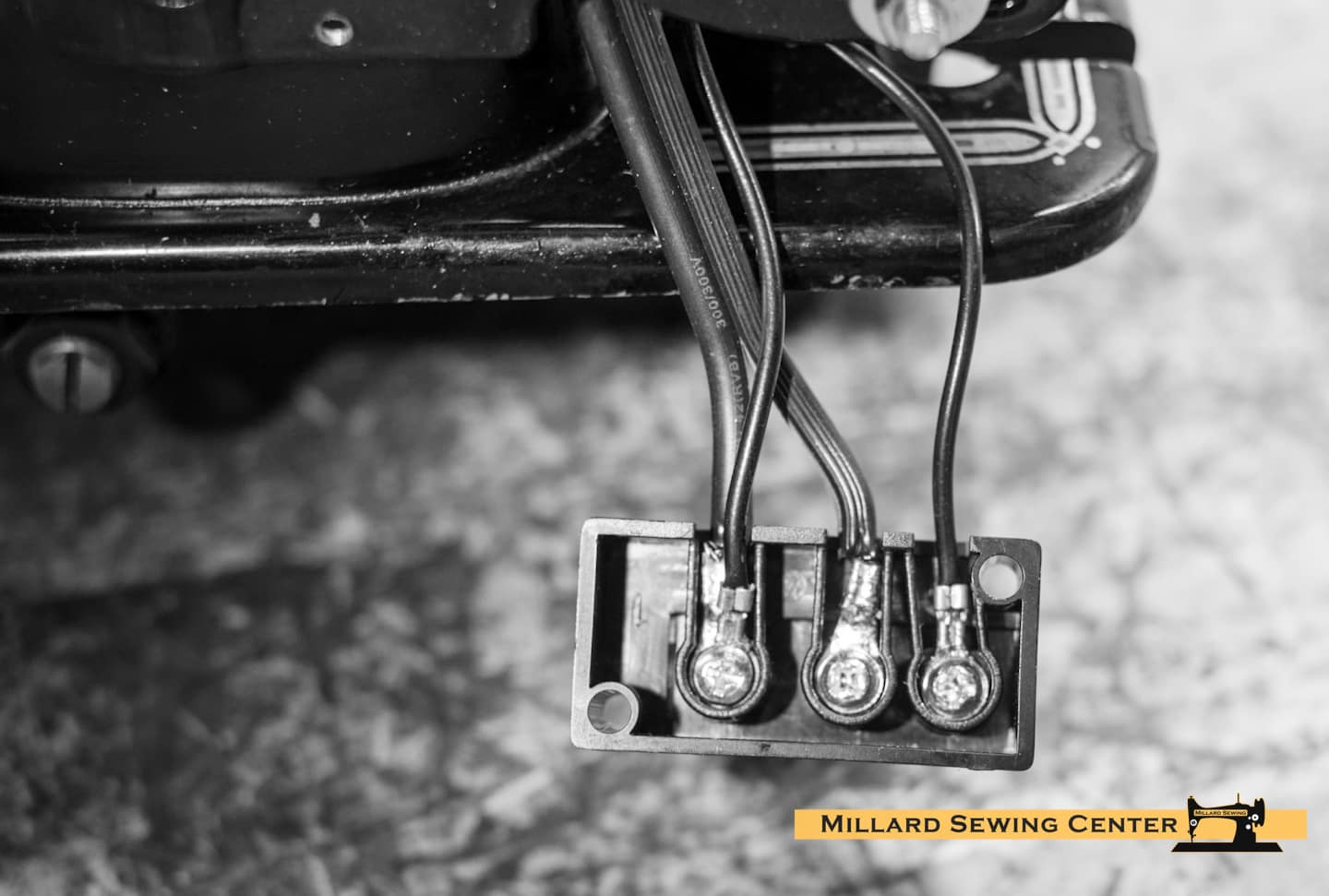 Attach the light cord as pictured. With the wires exiting towards the top of the plug remove the left side wire. Move this original screw to the center position with one light wire. Use the Millard Sewing provided screw to reattach the left motor wire along with the other light wire to the left position. Reinstall the power connection block.