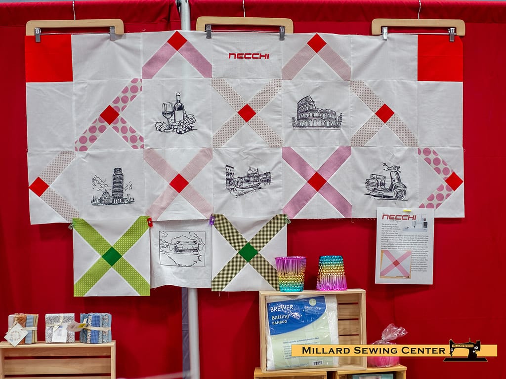 What good is going to a quilt show if you don’t do a little quilting? If you read our blog introducing our new Necchi Sewing Machines then you might already be aware of our “Old Italian Block” project. If not shame on you! In the days leading up to the show we assembled the top half of the quilt utilizing a combination of custom embroidery blocks designed by us to represent some of our favorite aspects of Necchi’s home country of Italy. These are framed by the “Old Italian Quilt Blocks” which used this way make a nice lattice effect. At the show we got a chance to use the Necchi Creator Series C2000 to stitch out some new rough drafts of the next embroidery patterns that we have developed. While that was busy working on the embroidery, the C360 was used to piece some of the green blocks that will make up the lower part of the quilt.