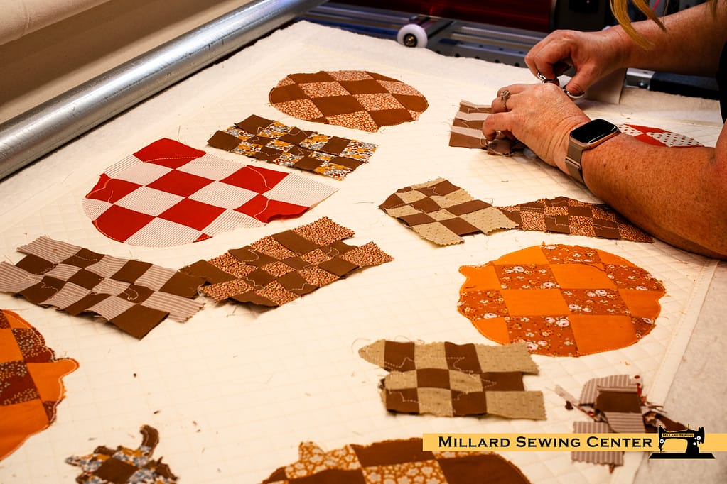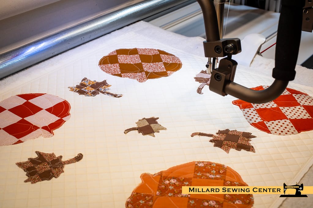 Because our project was done on the longarm, we had masked out the location of each pumpkin and each leaf while doing the cross hatch stitching.