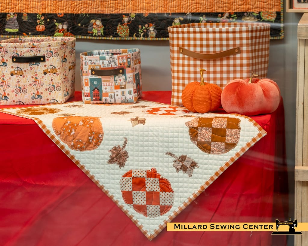 We used a combination of Tilda Creating Memories Collection Autumn Charm Pack and and some select Riley Blake Confetti Cotton Solids to make some small patchwork sections. The leaves are done in 1″ squares and the pumpkins are finished in 2″ squares.