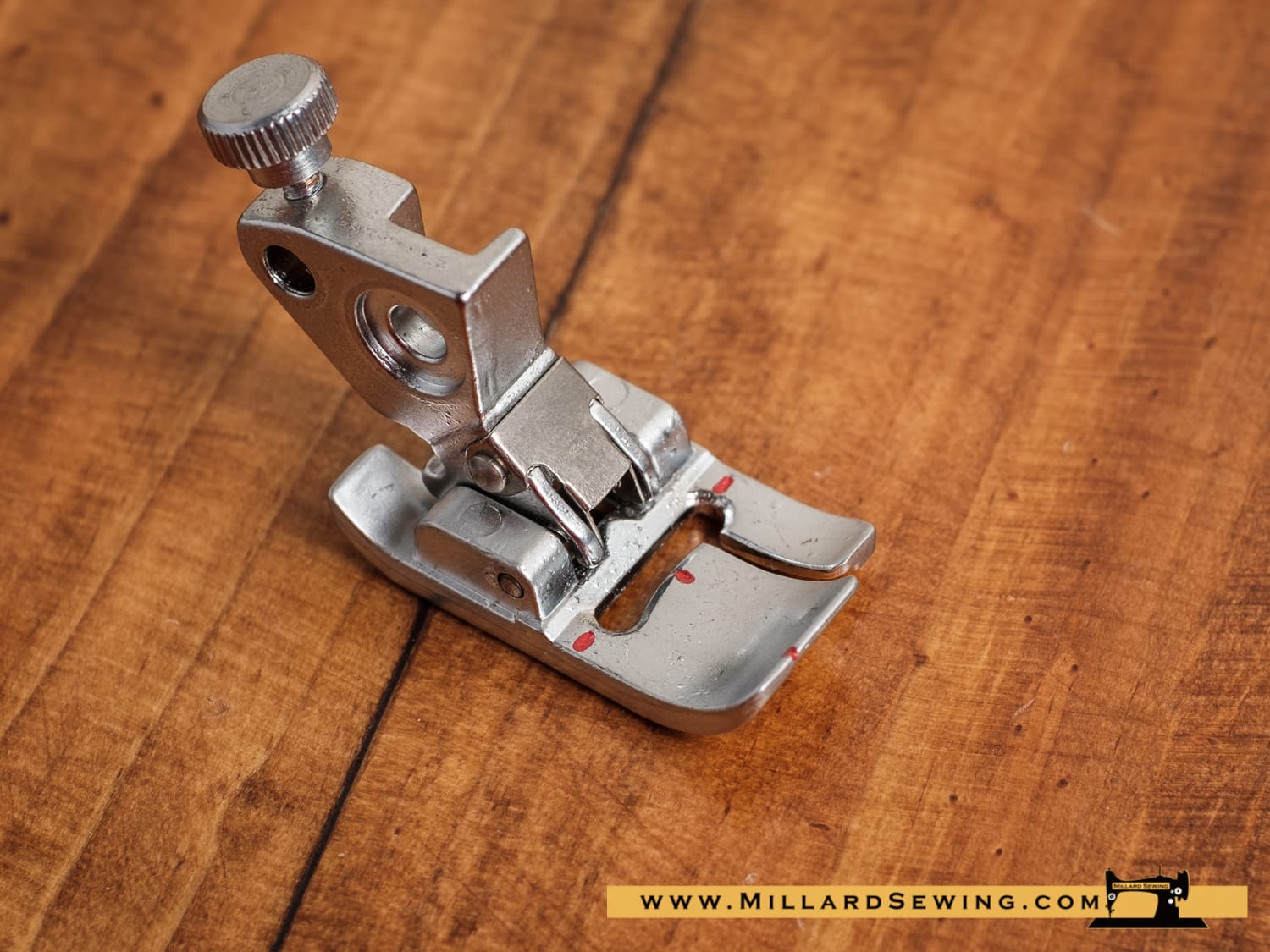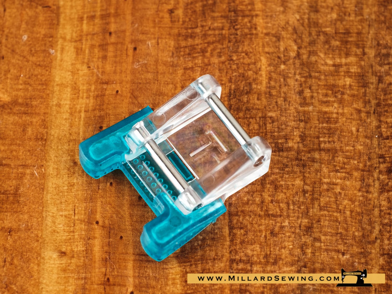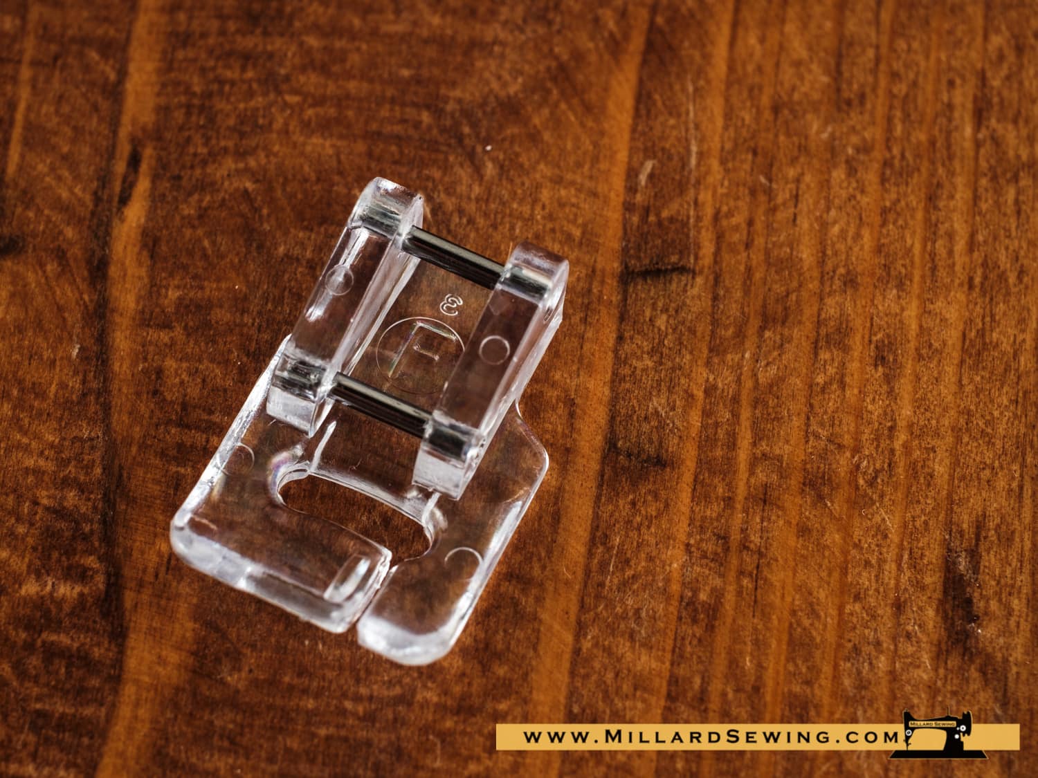 This foot has a 1/2 inch outer diameter so that the needle drops 1/4 inch from the ruler edge.