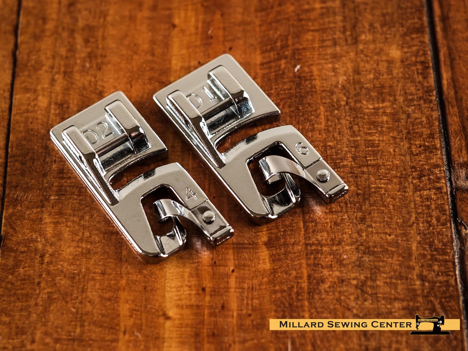 The kit pictured includes two feet to make 4 mm and 6 mm wide rolled hems.