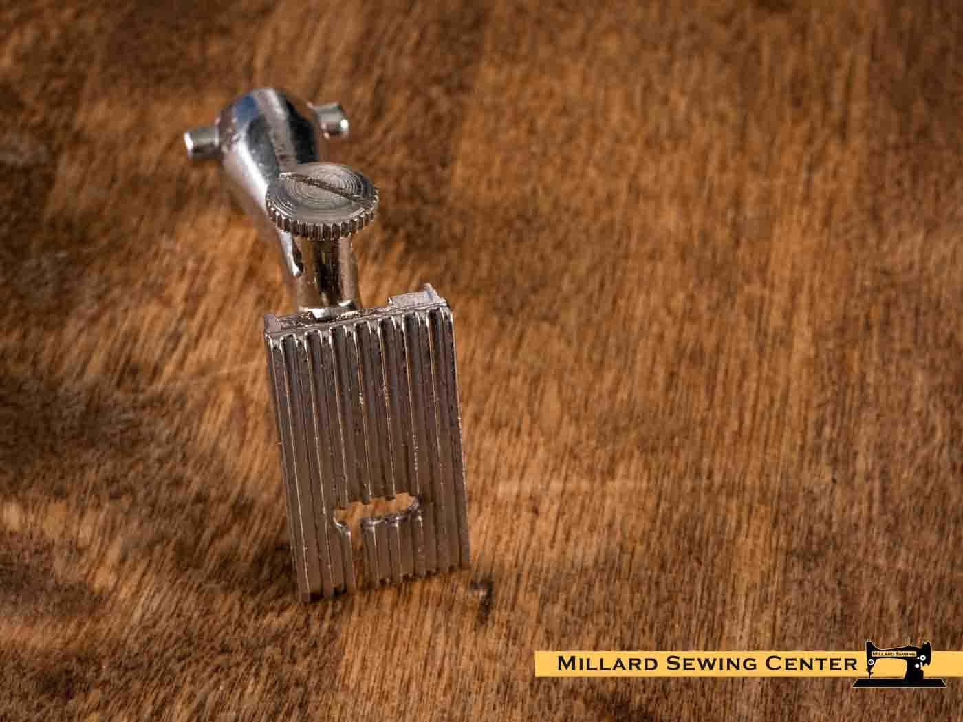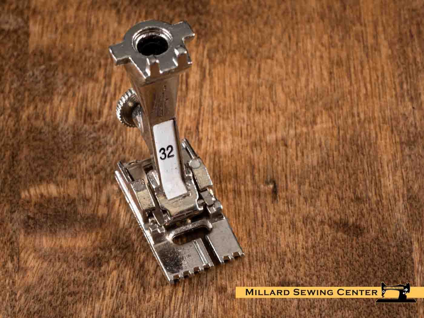 Pintuck Foot, #32, 7G. This foot is the easiest, fastest, and most accurate way to create distinctive, eye-catching pintucks. The grooves are used to ensure your pintucks are perfectly spaced without any tedious measuring or marking. All you need is a twin needle, two spools of thread, and your creativity. This presser foot is an ‘Old Style’ foot.