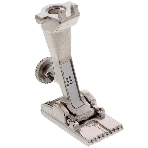 Pintuck Foot 9G, #33. This foot is the easiest, fastest, and most accurate way to create distinctive, eye-catching pintucks. The grooves are used to ensure your pintucks are perfectly spaced without any tedious measuring or marking. All you need is a twin needle, two spools of thread, and your creativity. This presser foot is an Old Style foot.