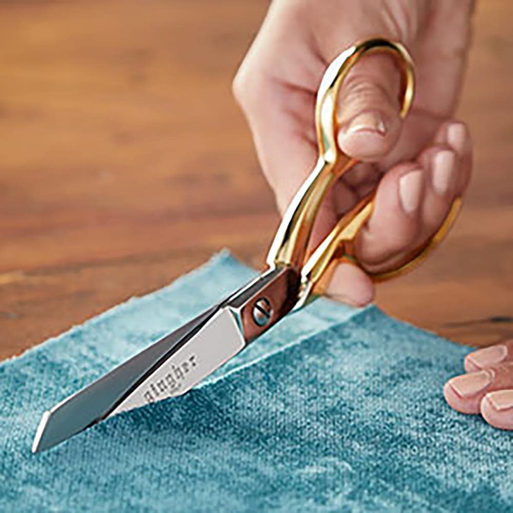 Gingher Knife Edge Dressmaker Shears: 8 inches. Sewing and craft enthusiast will appreciate the added elegance of gold-plated handles on the classic 8 inch sheers. Beautiful and exquisite enough to be a gift or collectors piece, yet strong and tough, these finely crafted knife edge shears cuts easily through multiple layers of fabric. This package includes on gold-plated 8-inch knife edge dressmaker’s shears.