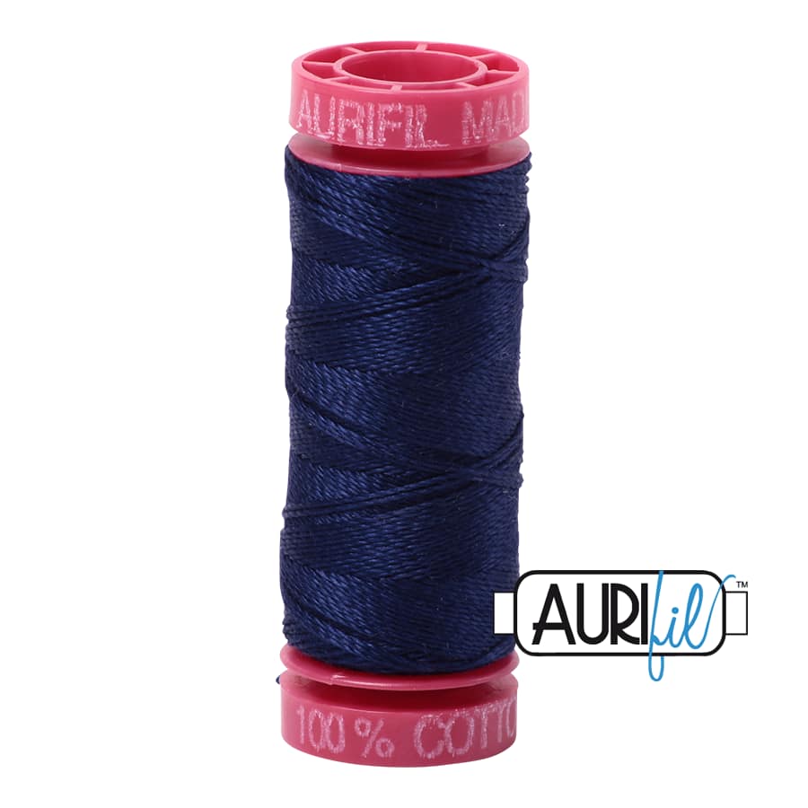Aurifilโs 100% Cotton 12wt/2ply thread comes in all 270 of our Cotton colours and is wound on a red spool. It is the heaviest weight thread that we offer and is perfect for hand applique, hand embroidery, hand quilting, cross stitch, embellishment, handmade lace, machine applique, blanket stitch, machine embroidery (especially for designs that use a longer stitch length), machine art quilting, Sashiko, redwork, lower looper serging, and longarm quilting.
