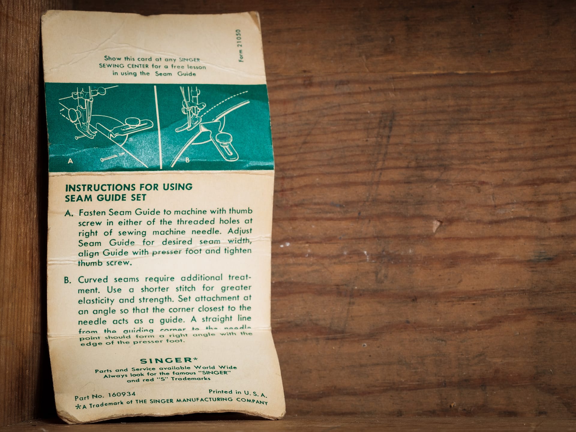 Singer seam guide on that classic 60’s card. Card isn’t in great shape, but the guide inside is still NEW, and full of that vintage magic*.