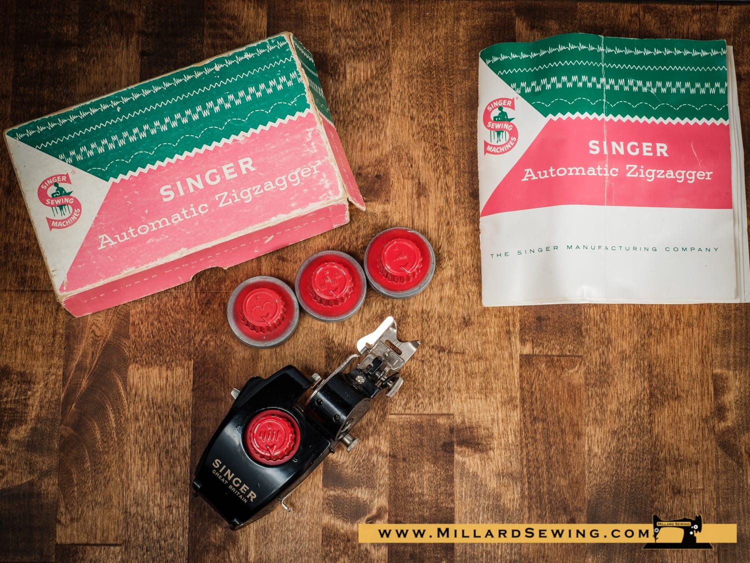 Singer Automatic Zig Zagger.ย Convert your straight stitch Singer Model 301 (or other slant needle straight stitch machine) to a machine capable of 4 Zig Zag Patterns! (Even more with added cams) Just like all of our machines this unit has been serviced and tested prior to sale.