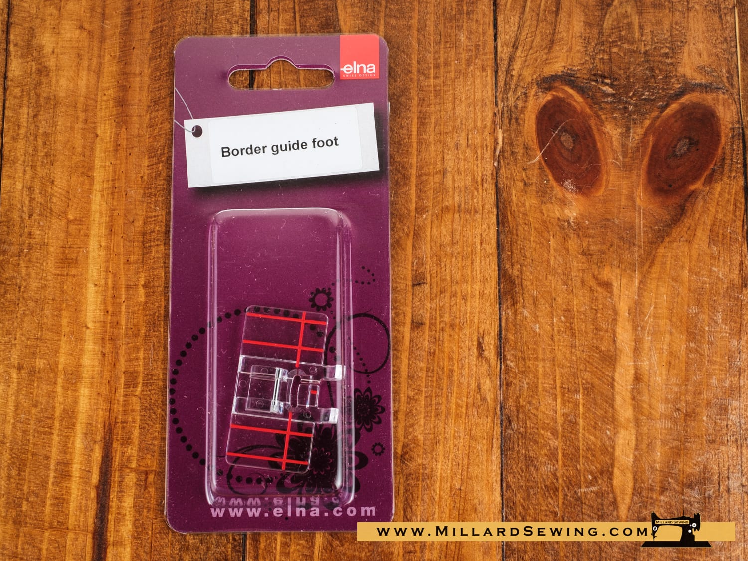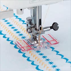 The satin stitch border guide foot allows you to create evenly spaced rows of satin or decorative stitches. Use the red reference lines to guide your sewing or to center your decorative stitches. No need to stretch threads or to mark lines on the felt!