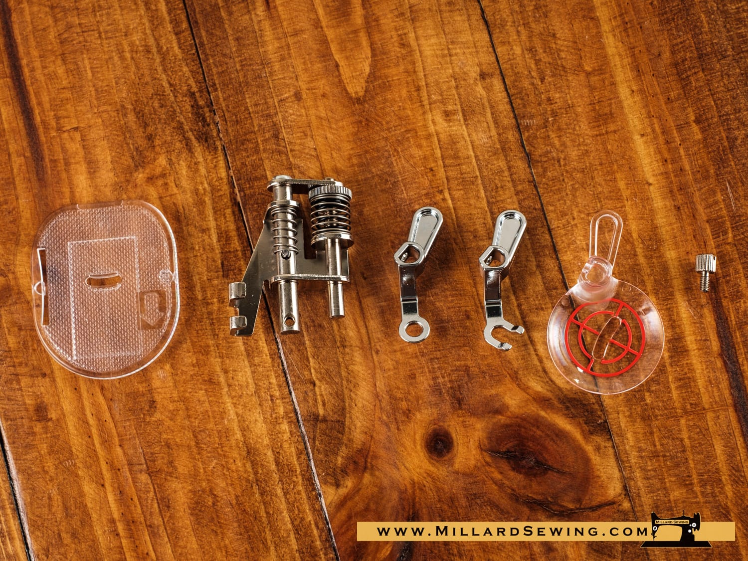 The set comprises: three different feet and one holder. The feet are attached to the holder with a screw for maximum sturdiness and safety. The set includes one clear view foot for uneven surfaces, one open toe foot for extra visibility and one closed toe foot for general use.