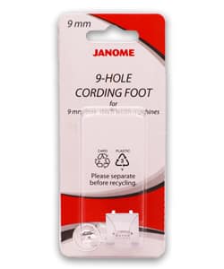 When a bold decoration is needed, cording is an excellent option. And for the boldest impact, you’ll want to use many strands. The 9-Hole Cording Foot allows you to use five or seven strands of cording to create wide lines. Using all the same color cording creates a thick solid line. Or try using multiple colors for a gradient or rainbow effect. The 9-Hole Cording Foot will fit all 9mm machines that accept snap-on presser feet.