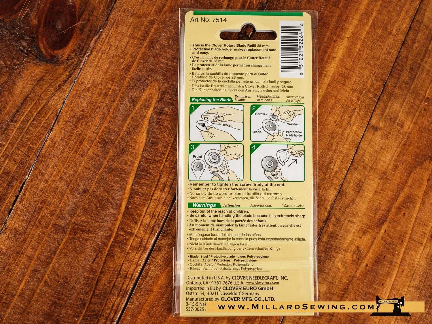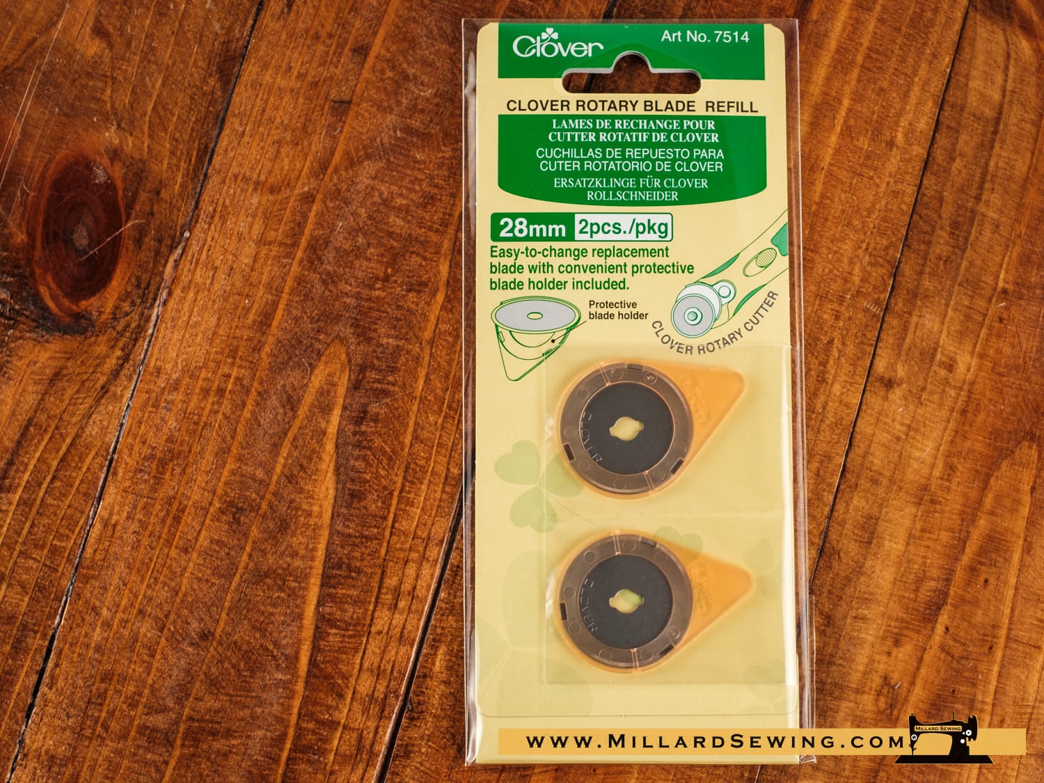 Circular rotary replacement blade for Clover’s 28mm rotary cutters. No more nicked fingers from changing the blade of your rotary cutter. Each blade is packaged separately in a tabbed safety holder allowing you to change the blade without even touching it.