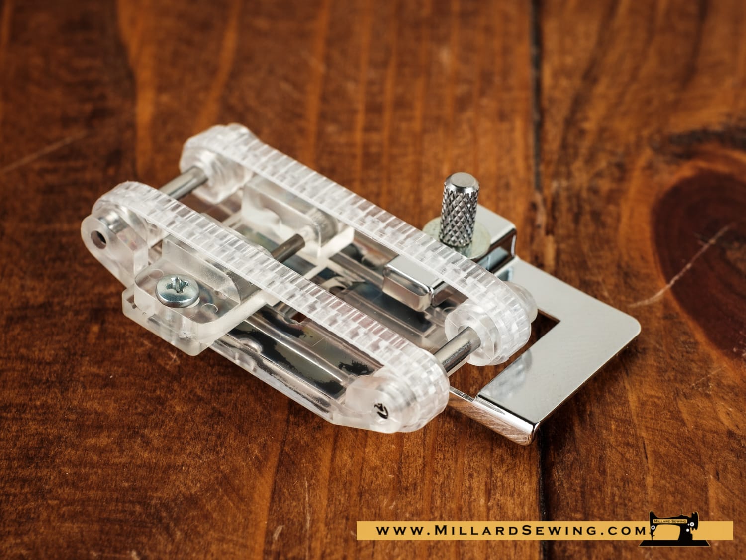 The Rotary Even Foot is effective for preventing fabric from slipping or puckering. It’s especially useful when sewing stretchy materials like knits and hard-to-feed materials like leather or vinyl. The presser belt rotates to feed the upper and lower layers of fabric without slippage so they are fed simultaneously.