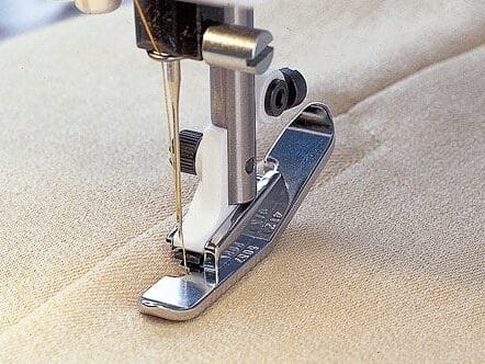 - Select center needle position straight stitch. Snap on the Narrow Zipper Foot to the left of the needle.