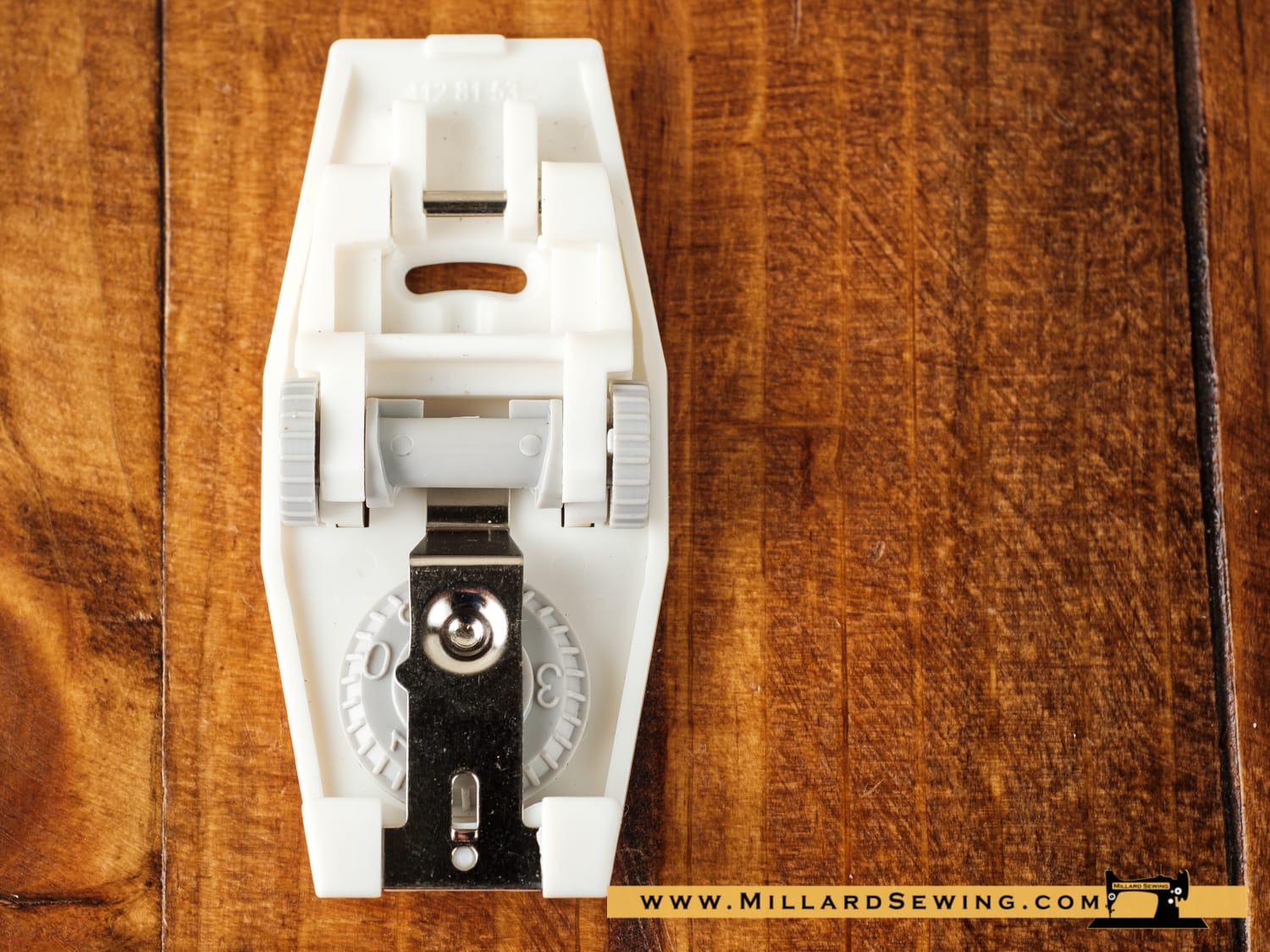 The Elastic Foot stretches and guides 6 to 12mm wide elastic as it is sewn in place. Use it for lingerie, action wear, and other elastic insertion techniques.
