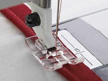 Insert packaged piping into seams and edges for a tailored finish. Cover cord with fabric for specialty Piping. The clear view allows you to see the piping placement and see exactly where you are stitching. The clear view enables you to see the first row of stitching and adjust your needle position to stitch next to the original row. Straight Stitch, length 2.5.