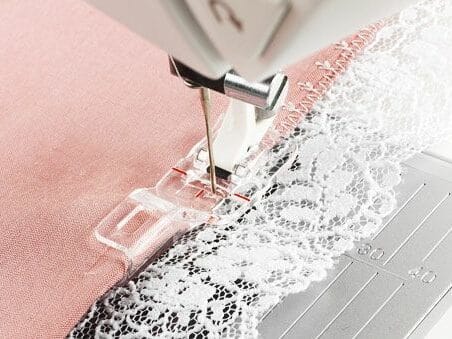Use the Join and Fold Edging Foot together with different types of edging, such as lace, embroidered trims or various fabrics, along with the beautiful HUSQVARNA VIKINGยฎย stitches to create beautiful edgings. Make lingerie in a snap, add lace to create beautiful handkerchiefs or delicate table toppers. This foot will easily guide the edging and the base fabric through the openings in the front of the foot, fold the base fabric and simultaneously sew the edging in place.