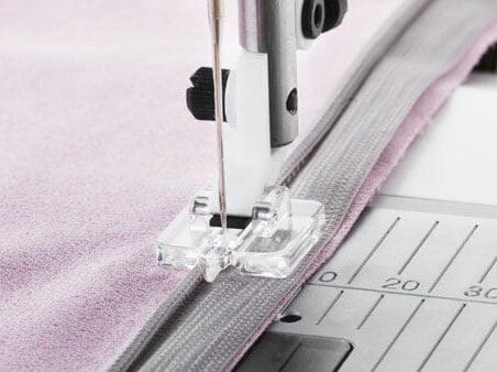 - Carefully press the zipper teeth slightly to the right and lower the presser foot, so that thecoil lies in the groove to the right of the needle.