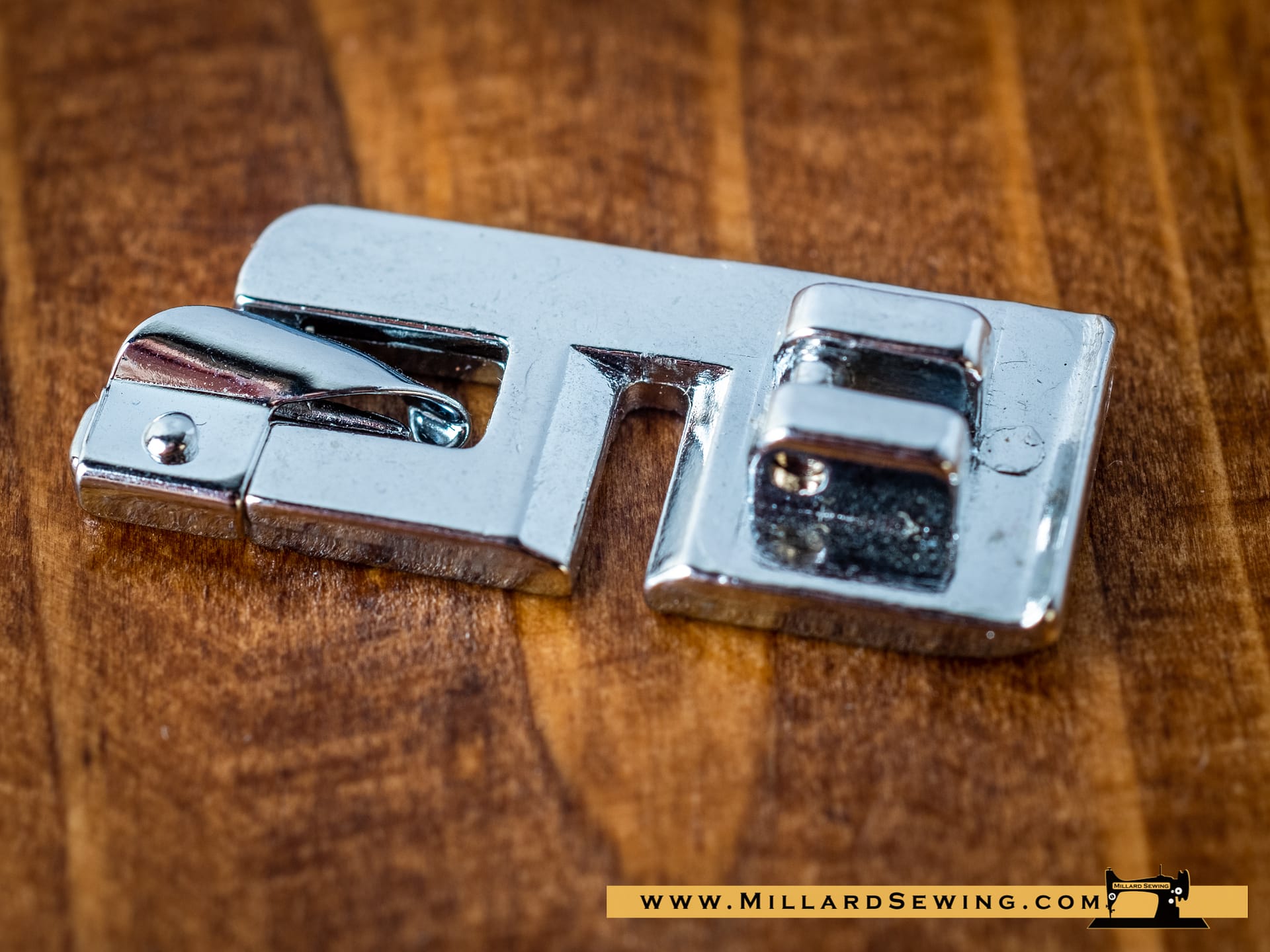 Hemmer foot for slant needle sewing machines with Singer style Snap On Adapter. Feed your fabric through the small funnel located on the front of the foot. The funnel turns the fabric under while the needle stitches it down to create a perfect narrow hem.