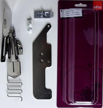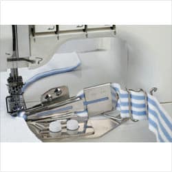The tape binder is used for finishing and covering the raw edges of stretch fabrics. The binder folds the fabric you wish to use as tape around the raw edges as you sew, allowing you to make beautifully finished necks and arm holes and bind any raw edge with ease.