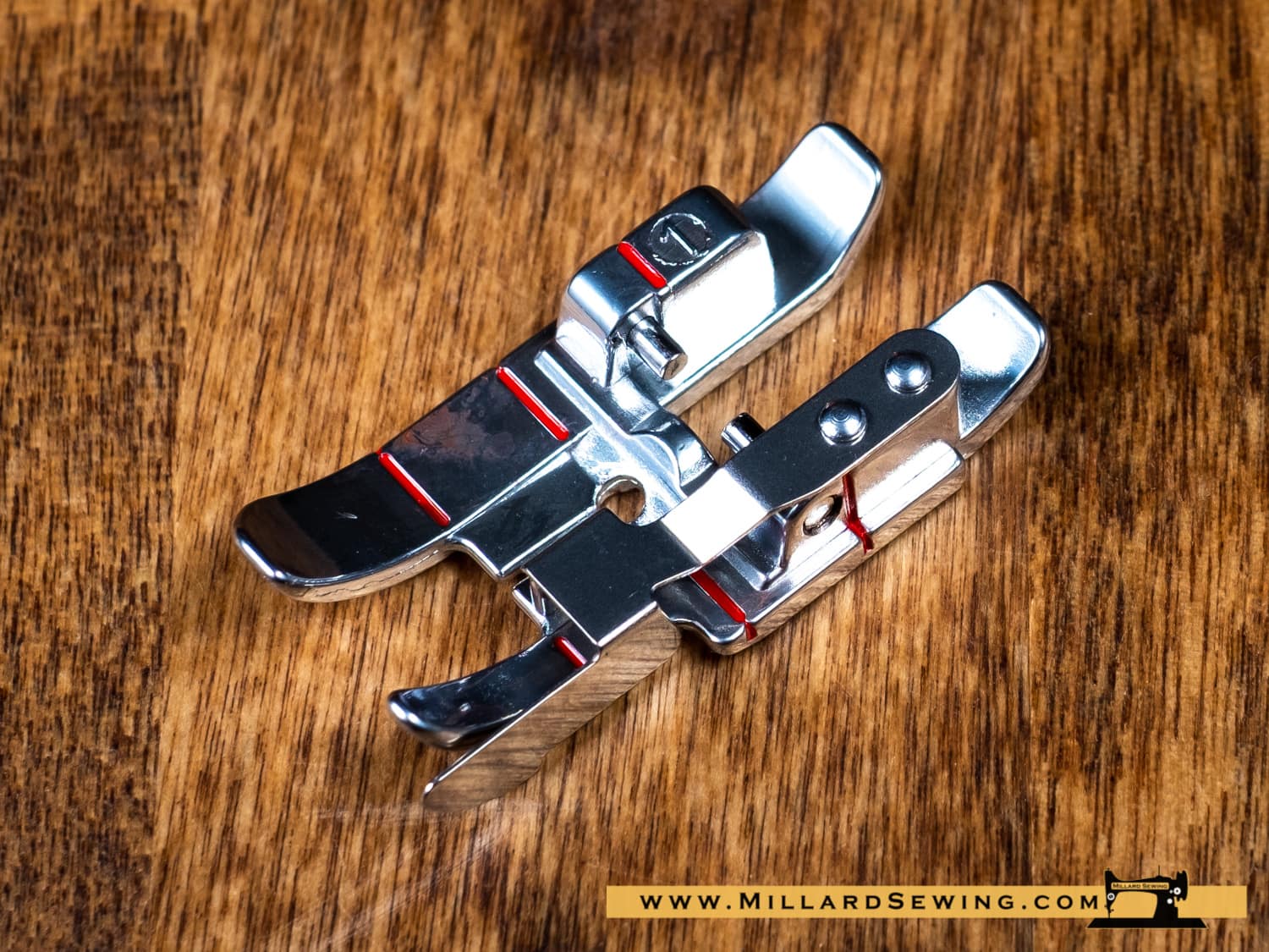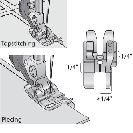 The Perfect ¼” Foot is designed to help you achieve a ¼”(6mm) or scant ¼” (5.9mm) seam when piecing. The needle hole in the foot is oval shaped allowing you to adjust the needle position. The distance between the center needle position and the guide is less than ¼” (6mm).
