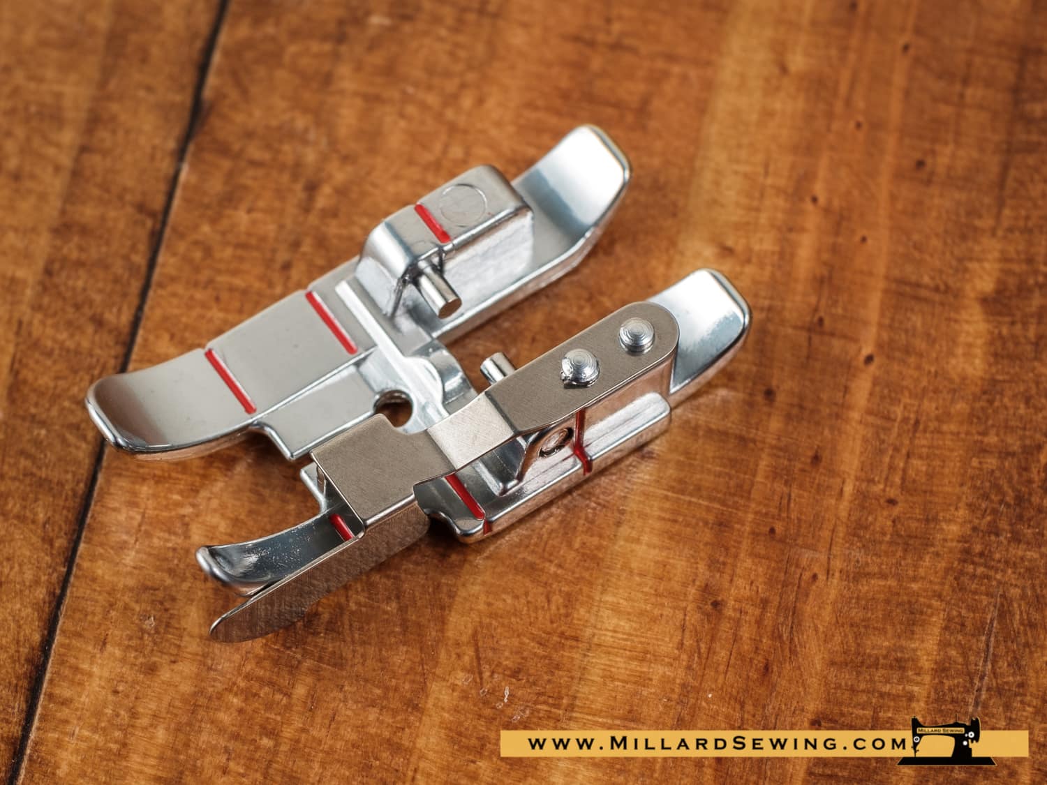 The 1/4 inch Right Guide Foot is designed to help you achieve perfect 1/4 inch seams when piecing. Simply keep the fabric edge next to the guide. The distance between the needle and the right guide is 1/4 inch.
