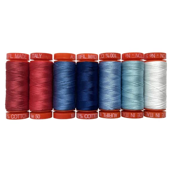 To complement her fabrics, Amy curated a 7-spool Aurifil thread set of 100% Cotton 50wt, an array of modern patriotic hues in red, white, and blue. Perfectly balanced for piecing, quilting, and embellishing, this set offers makers the ideal tools to craft beautiful and meaningful projects that honor both tradition and creativity.
