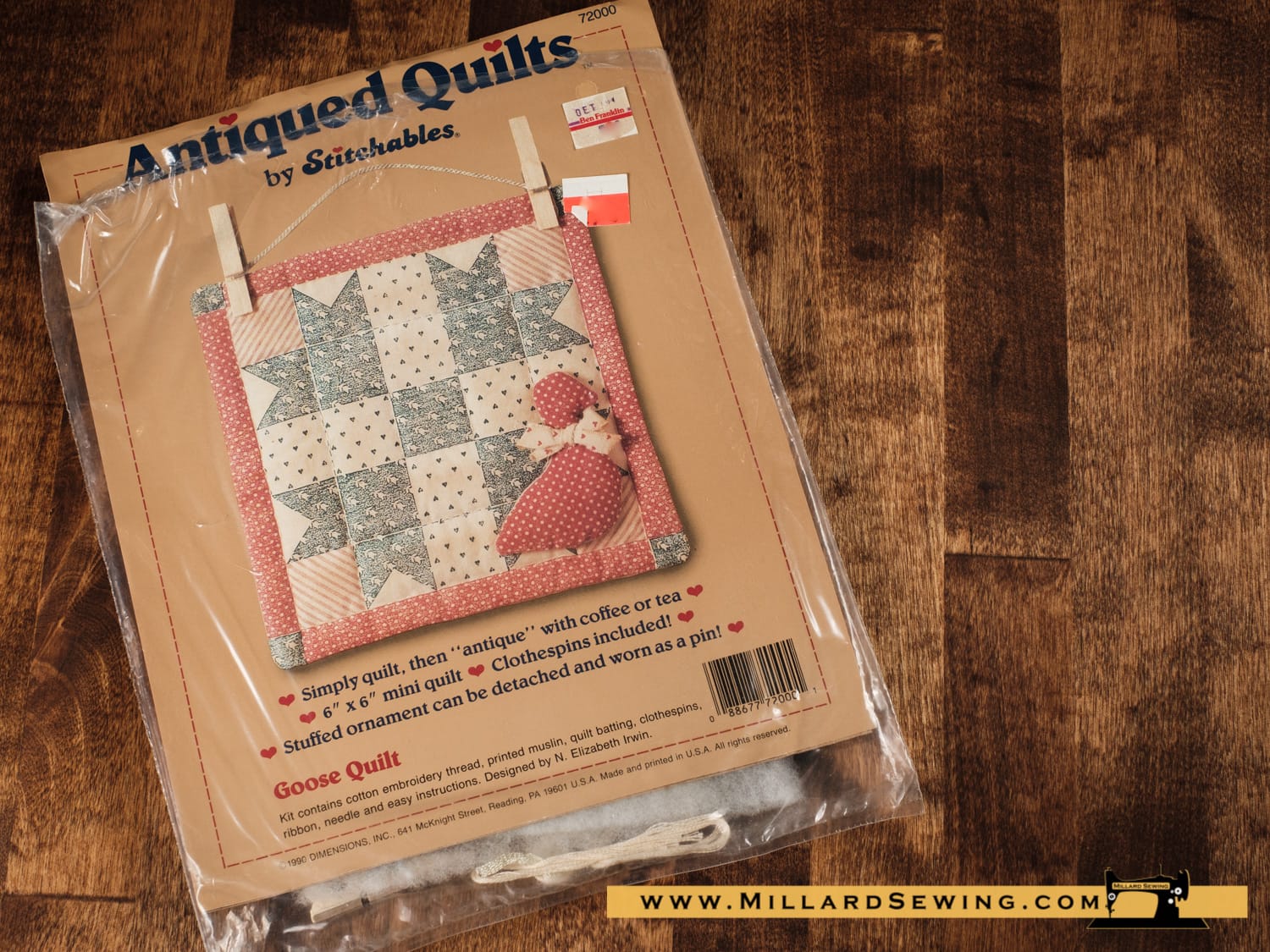 Antiqued Quilts by Stitchables. This is the Goose Quilt. Simply Quilt then “antique” with coffee or tea. 6″x6″ mini quilt, clothespins are included.