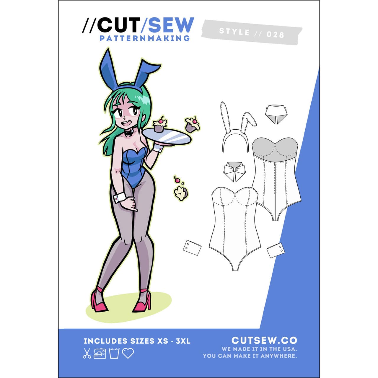 The 80’s are back, guys – we did it. This retro anime-inspired leotard is made for non-stretch fabrics and features a center back zipper, built in boning, and bra cups for extra support. With high cut leg lines for a dramatic oh-so-80’s silhouette, complete the look with a snap closure shirt collar, elastic cinched cuffs, and wired bunny ears.