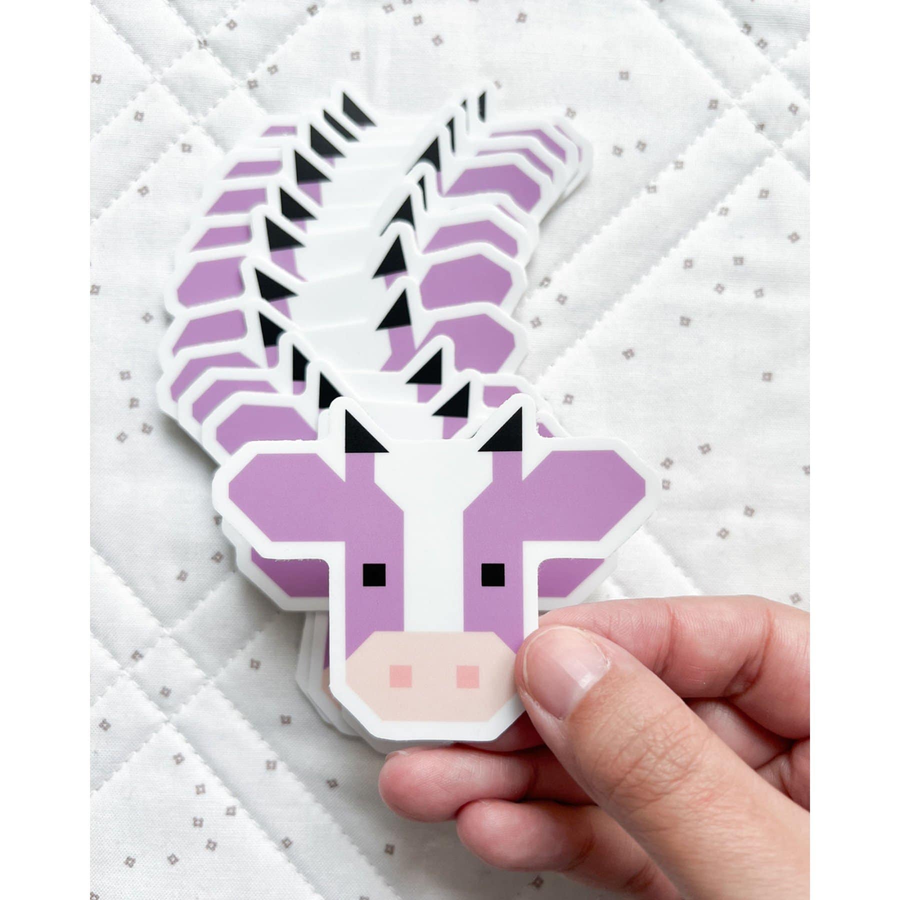 Inspired Cotton and Joy’s ever popular Annabelle the cow quilt pattern, this fun sticker is the perfect addition to your life or as a gift for your quilty friends! This high quality vinyl sticker can be placed on water bottles, sewing machines, laptops, and more. Made of waterproof/dishwasher safe vinyl.