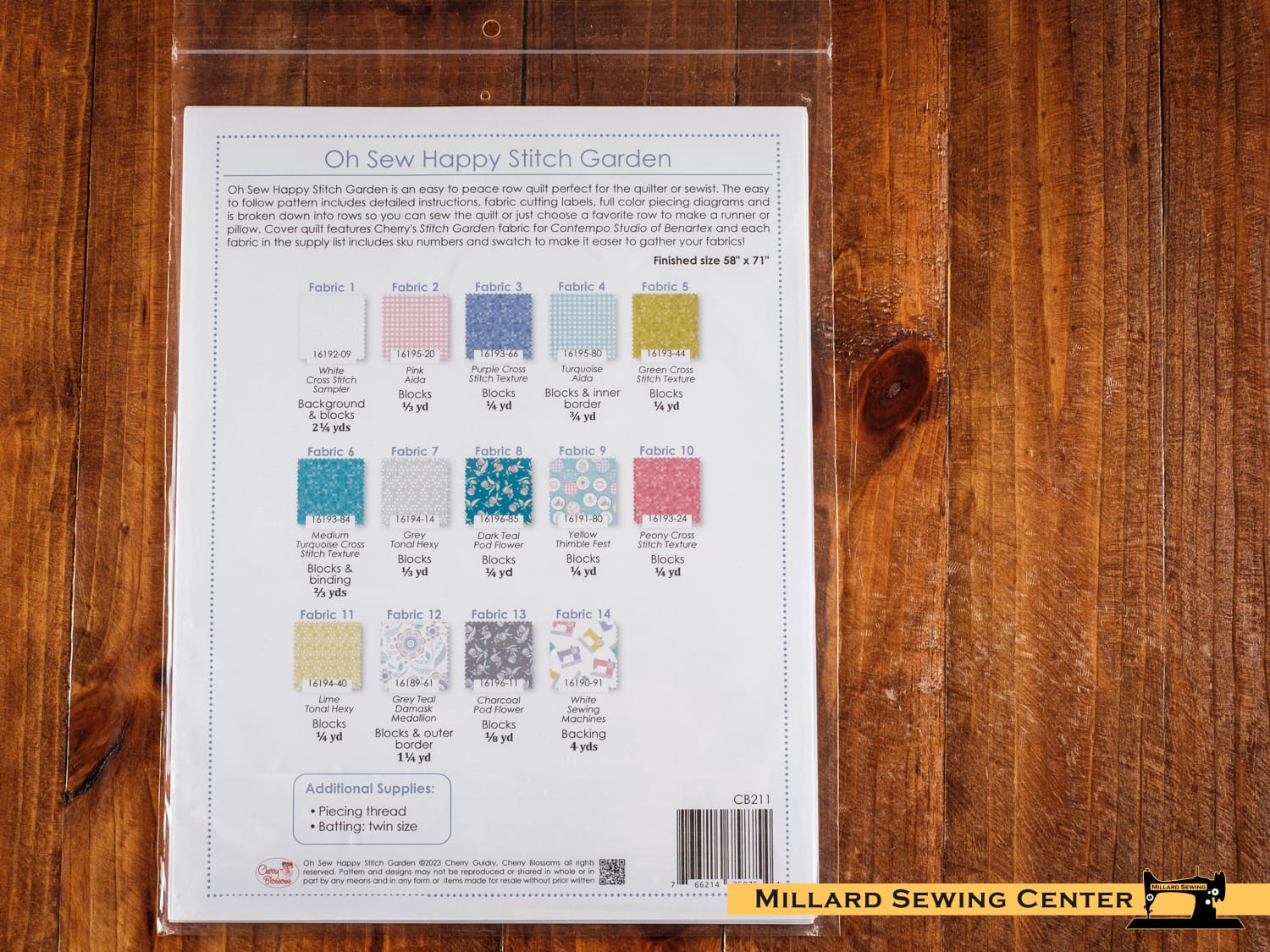 Oh Sew Happy Stitch Garden is an easy to peace row quilt perfect for the quilter or sewist. The easy to follow pattern includes detailed instructions, fabric cutting labels, full color piecing diagrams and is broken down into rows so you can sew the quilt or just choose a favorite row to make a runner or pillow… also a great Block of the Month project, the pattern is printed in rows so it’s easy to kit as monthly installments. Cover quilt features Cherry’s Stitch Garden fabric for Contempo Studio of Benartex and each fabric in the supply list includes sku numbers and its swatch to make it easier to gather your fabrics! Finished size 58″ x 71″.