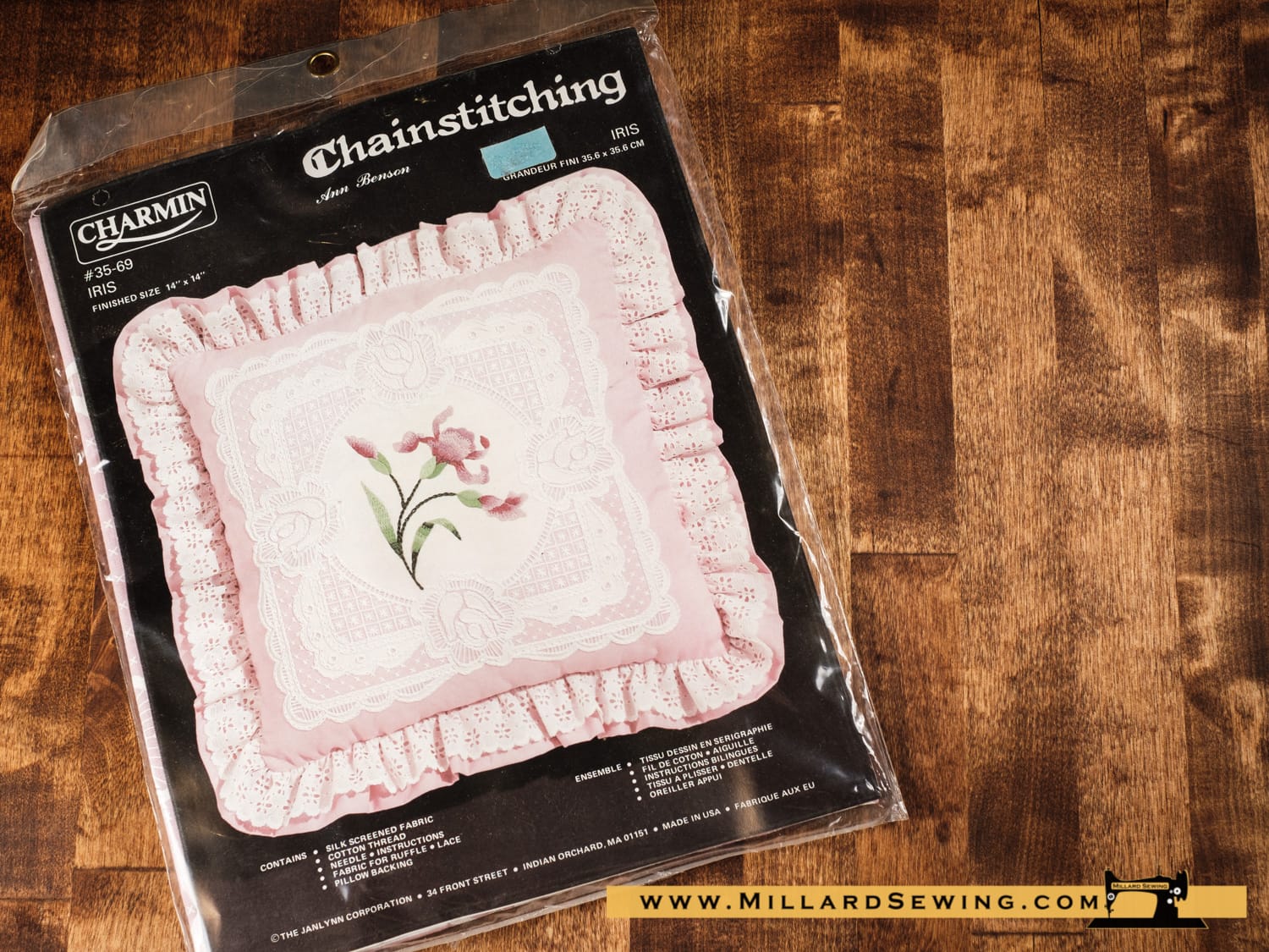 Chainstitching by Ann Benson – Iris. Finished size 14″ x 14″. Kit contains silk screened fabric, cotton thread, needle, instructions, fabric for ruffle, lace & pillow backing.