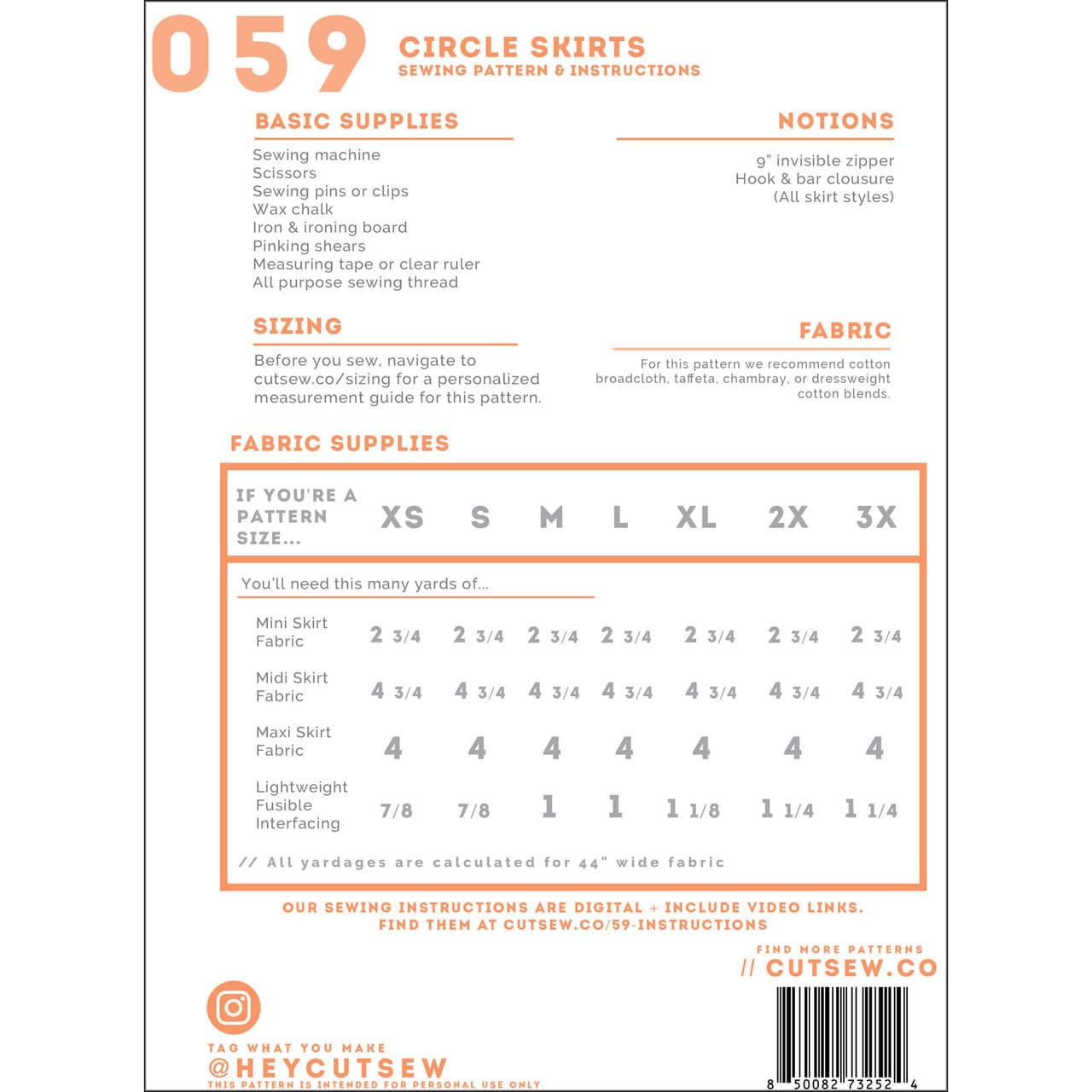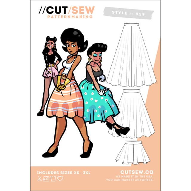 Good morning Baltimore! This set of three circle skirts covers all of your swingin’ fashion needs with three different lengths & fullnesses: a double circle mini skirt for maximum poof, a traditional knee length “poodle skirt”, and a calf-length 3/4 circle great for evening wear. All feature an invisible zipper closure and a waistband secured with a hook & bar. Make it your own with trim and appliqués, or make one as is for a night of twisting on The Corny Collins Show.