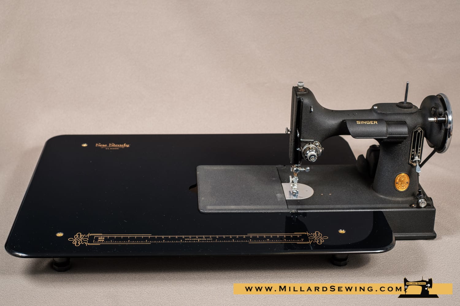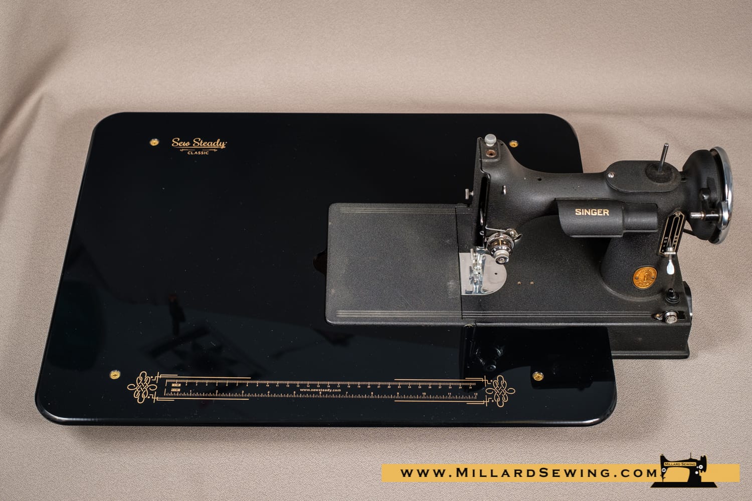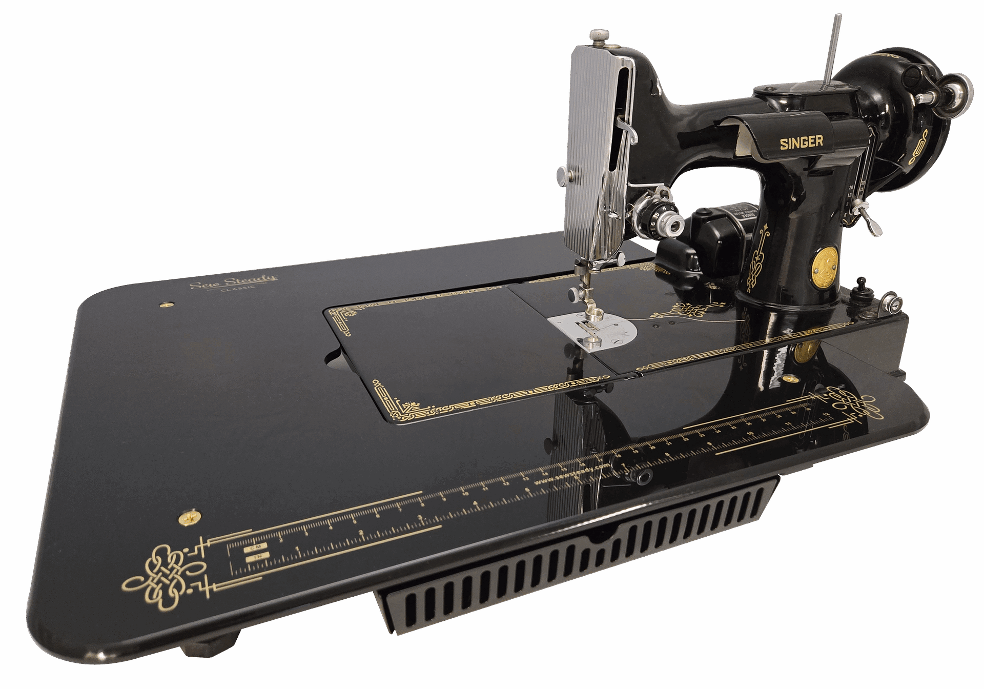 Inspired by the sewing machine that never goes out of style, our NEW Classic Mini Featherweight Table is made exclusively for the Black and Gold Singerยฎย Featherweight 221. Like our originalย Classic Table, the Classic Mini comes in black acrylic is printed with gold details, including a 12โณ ruler on the front edge. This 15โณ x 17-1/2โณ Table also comes with a 3โณ x 8โณ black metal drawer that pulls out on the front edge, perfect for storing your seam rippers, bobbins and sew much more!
