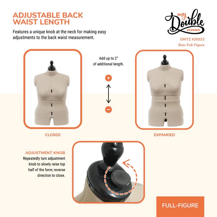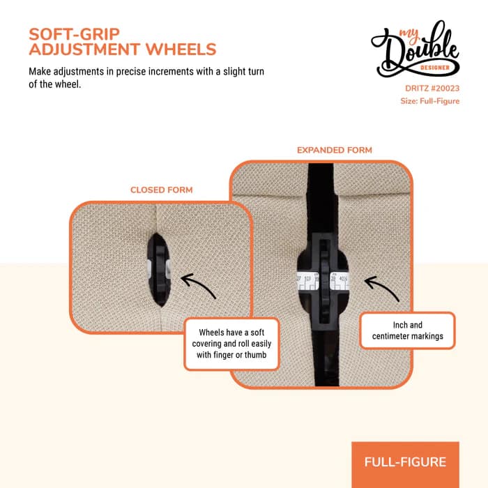 - 12 soft-grip rolling wheels adjust dress form in precise increments allowing you to customize the form to match your bust, waist, and hip measurements; decorative wood finial adjusts neck size