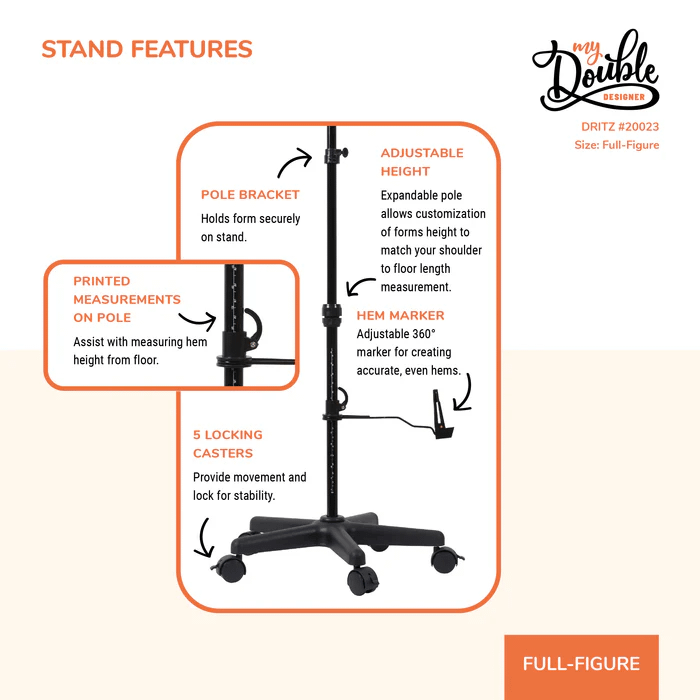 The Dritz My Double Designer Dress Forms help you fashion a double of your body providing you with professional looking garments. Use the form to audition fabrics and test the drape and overall look and feel before you start your project. The form is ideal for checking the fit of your pattern tissues and garment test muslin. The form assists with modifications and alterations to both new construction and ready-to-wear clothing that requires modifications. The forms fabric is a neutral colored cotton/polyester with foam-backing for easy pinning and marking when draping and designing.