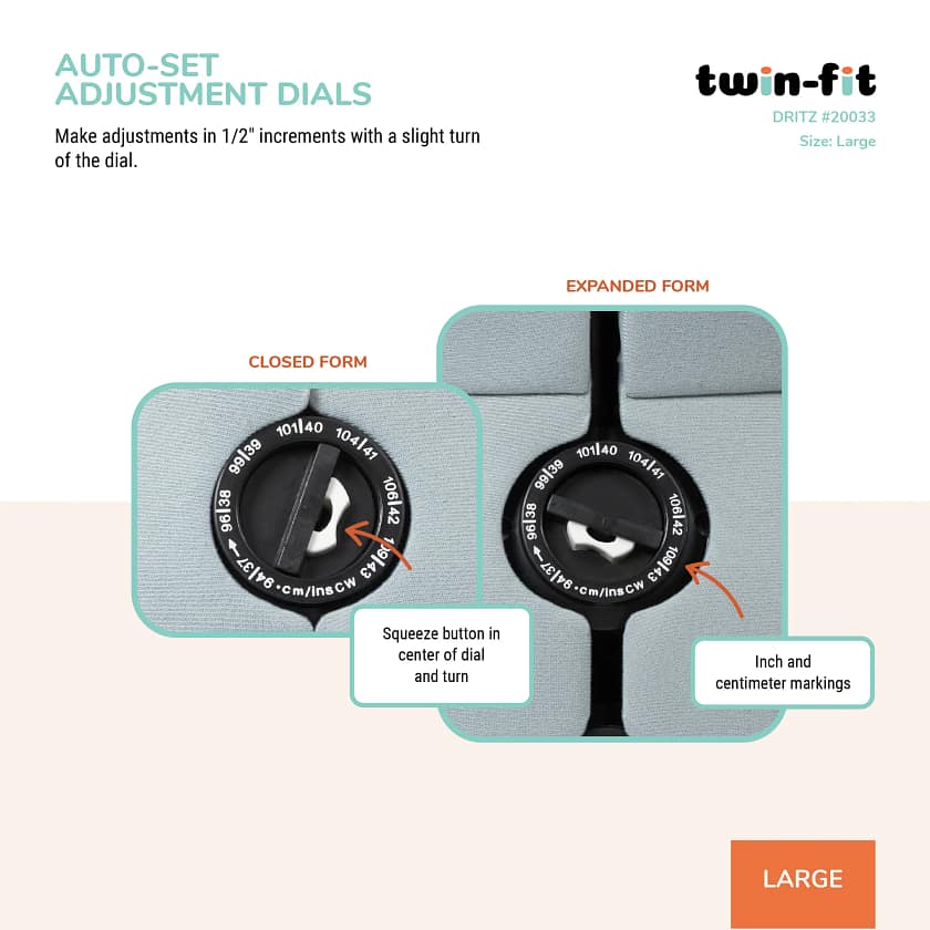 - 12 auto-set dials include inches and metric and adjust in ยฝโ increments by squeezing and turning dials
