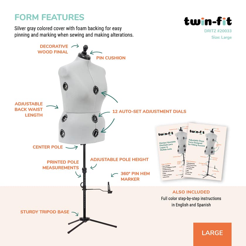 The Dritz Twin-Fit dress forms provide the seamstress with a body twin that matches their body size and assists with the fitting, construction, and alterations of garments. The forms fabric is a silver gray color with polyester fabric and foam backing for easy pinning and marking when making fitting, construction, and garment alterations.