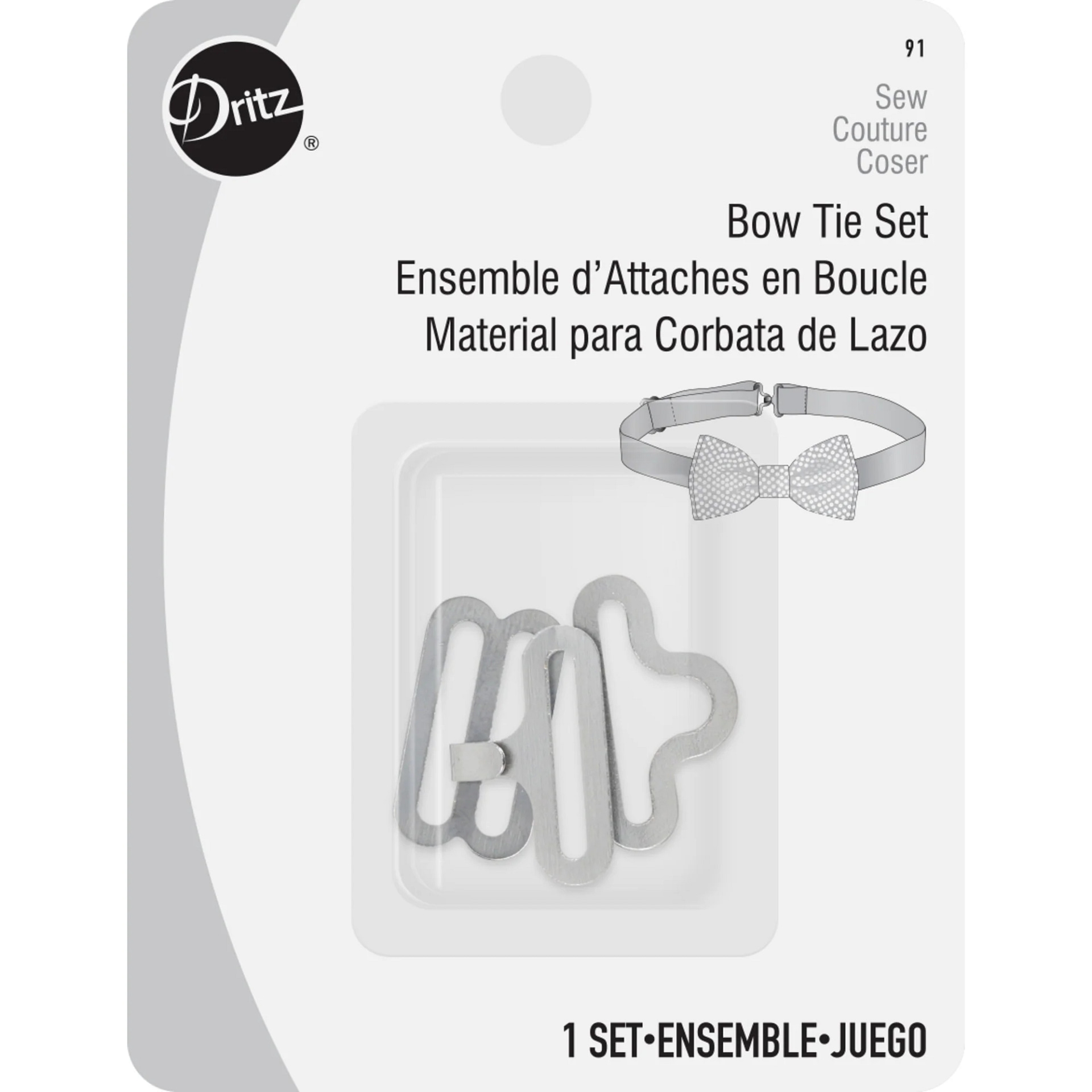 The Dritz bow tie set contains 3 pieces of hardware for making your own easy-sew bow tie. The strap can be made from the fabric of your choice or 5/8″ Dritz fold-over elastic.