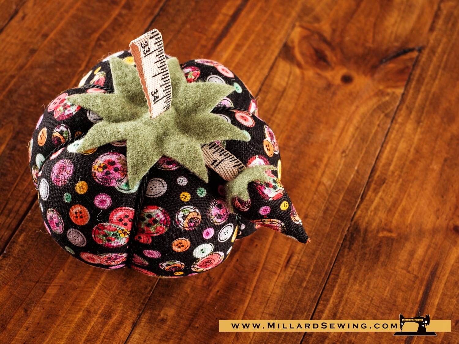 This oversized version of a tomato pin cushion is charming in a multi color button print fabric. Trimmed with a printed tape measure and hanging strawberry. This package contains a 4.875″ x 2.875″ inch tomato pincushion.