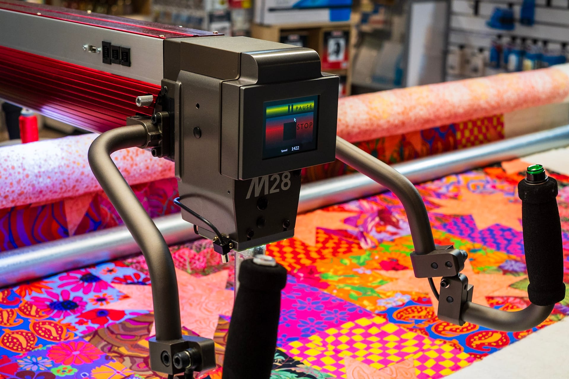 Our M28 longarm offers up to 24″ of quilting space, and is equipped with the Innova AutoPilot automation and Grand Format Embroidery.ย This allows us to offer you an unparalleled number of options when it comes to your quilting needs. The M Series Innova machines have an industrial level build quality that utilizes sealed ball bearings throughout and a rotary tension assembly which means less downtime for us and no chance for the accidental oil drips and and thread tension inconsistencies that have become synonymous with lesser brands.