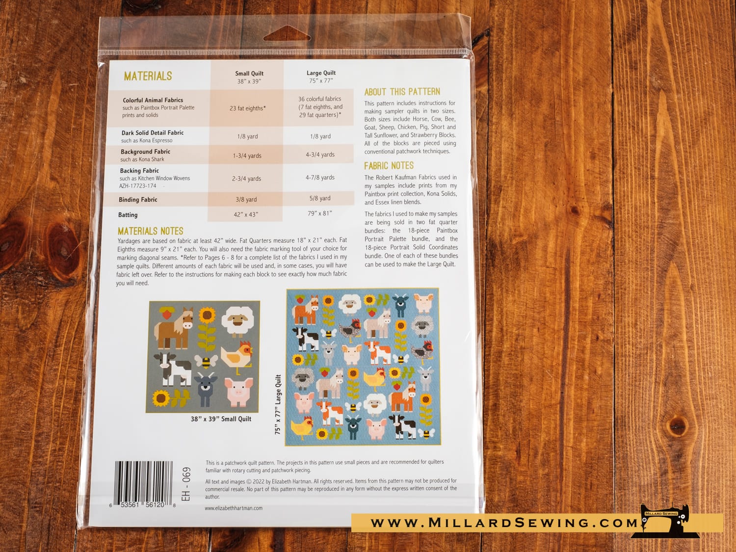 Make your own patchwork farm using conventional piecing techniques. Horse, Cow, Bee, Goat, Sheep, Chicken, Pig, Strawberry, and Sunflower blocks are included in two sampler sizes โ a 38in x 39in Small Quilt, and a 75in x 77in Large Quilt. The Large Quilt can be made with fat quarters, or a combination of fat quarters and fat eighths. The Small Quilt can be made with fat eighths.