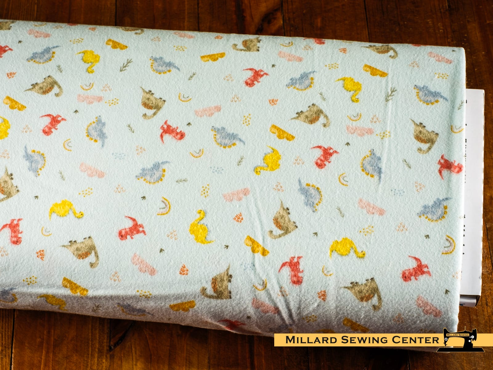 This double napped flannel by the RBD Designs for Riley Blake Designs is great for apparel, blankets, quilts and quilt backs. This print features scattered dinosaurs, clouds, leaves, rainbows, and more.