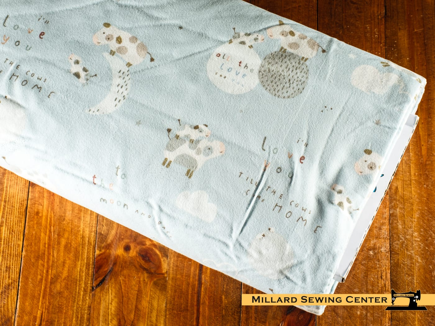 This double napped flannel by the RBD Designs for Riley Blake Designs is great for apparel, blankets, quilts and quilt backs. This print features cows, moons, stars, clouds, and the phrase, “I’ll love you till the cows come home.”