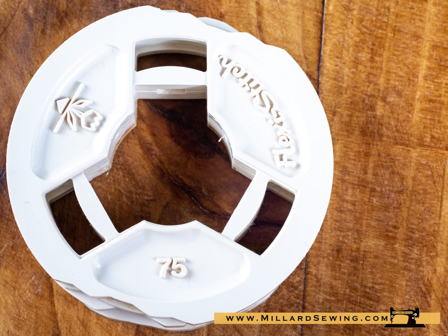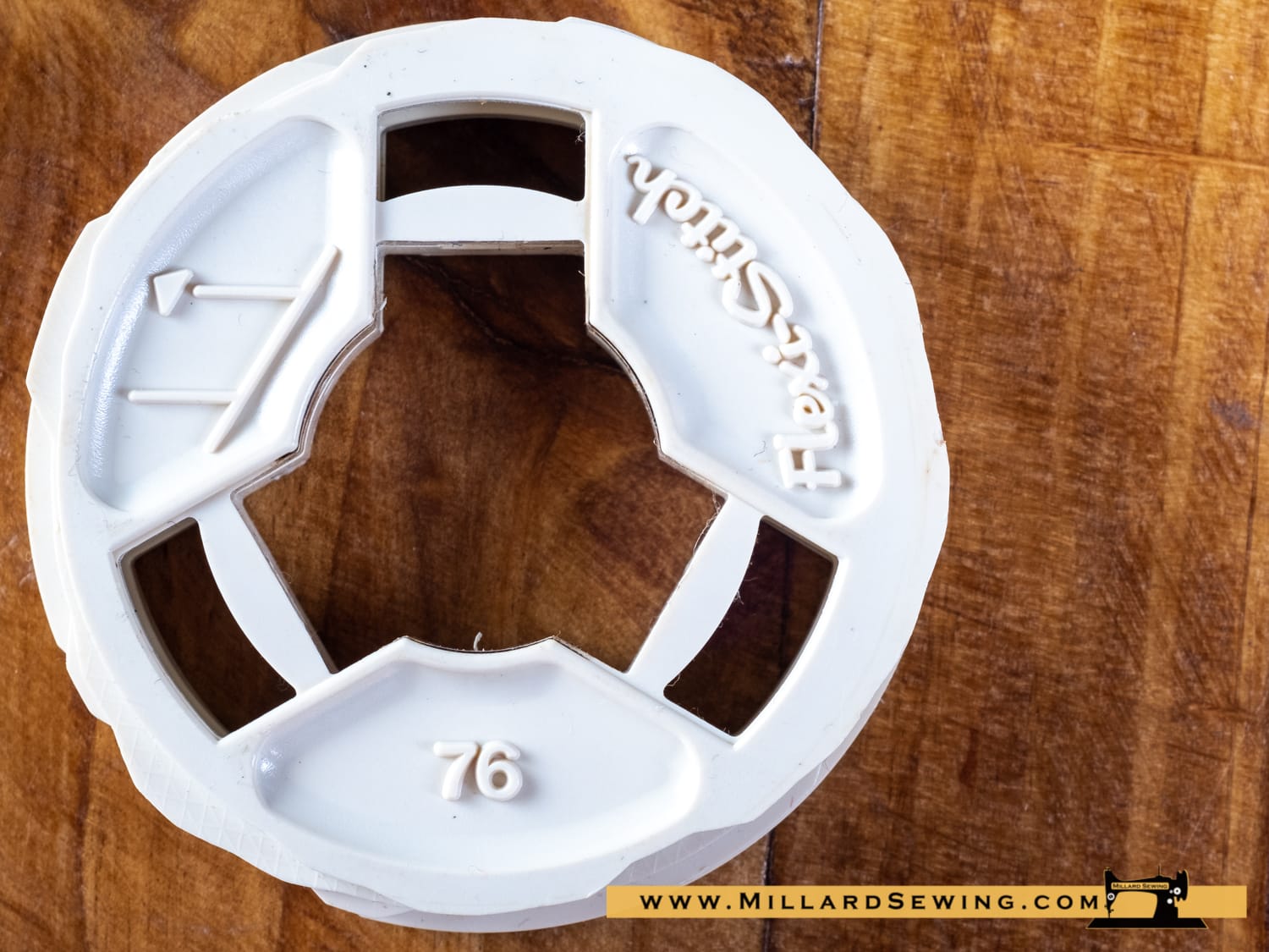 This is an original 1970’s Singer White Flexi Stitch 2-sided Cam Fashion Disc #75/76 sewing machine accessory is in very good used condition. Cam stitches both the Tulip stitch and Slant Over Edge stitch. Cam type F works with the Singer Futura series sewing machines 900 & 920.