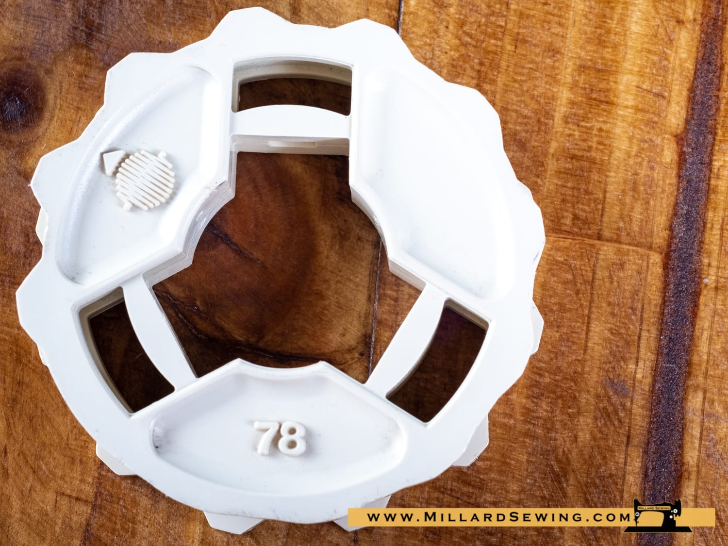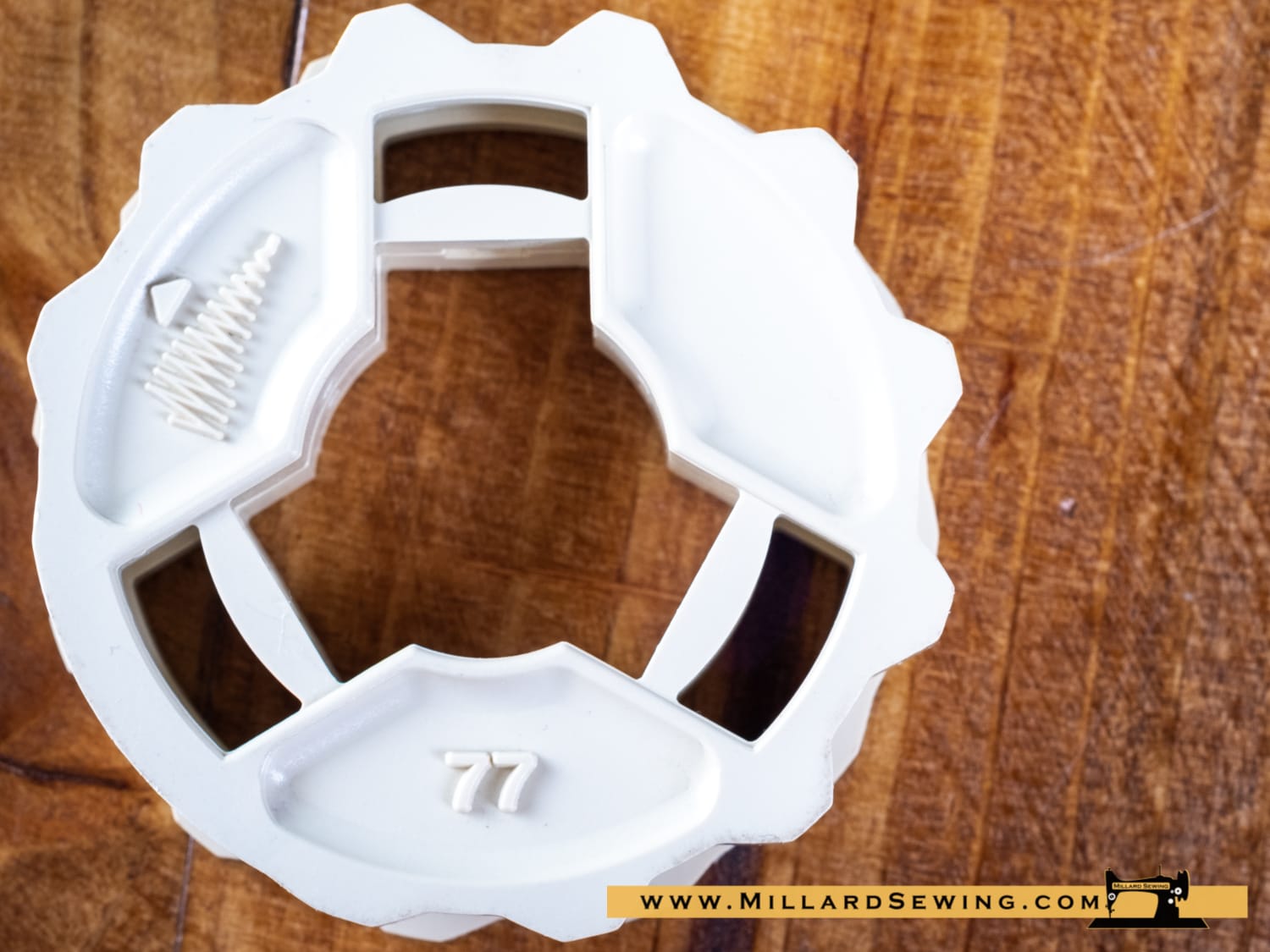 This is an original 1970’s Singer White Flexi Stitch 2-sided Cam Fashion Disc #77/78 sewing machine accessory is in very good used condition. Cam stitches both the Arrowhead stitch and Bead stitch. Cam type F works with the Singer Futura series sewing machines 900 & 920.