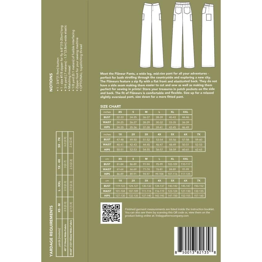 Meet the Flรขneur Pants, a wide leg, mid-rise pant for all your adventures – perfect for both strolling through the countryside and exploring a new city. The Flรขneurs feature a zip fly with a flat front and elasticated back. They do not have a side seam making them easier to cut and sew as well as making them perfect for sewing in prints! Store your treasures in patch pockets on the side and back. The fit of Flรขneurs is comfortable and flexible. Size up for a relaxed slightly oversized pant, size down for a more fitted pant.